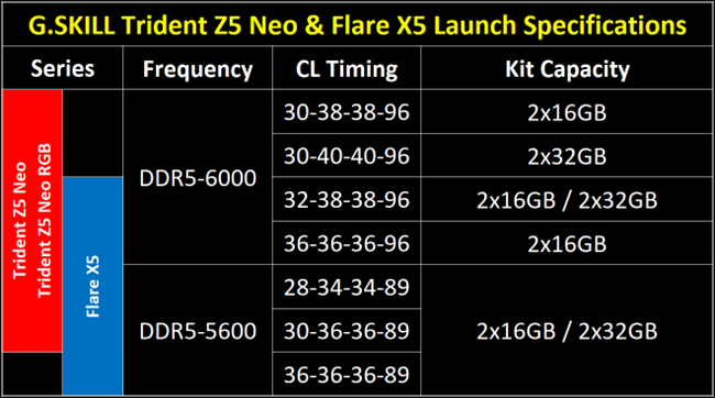 The Trident Z5 Neo, Trident Z5 Neo RGB, and Flare X5 series DDR5 memory kits will be available in September 2022.