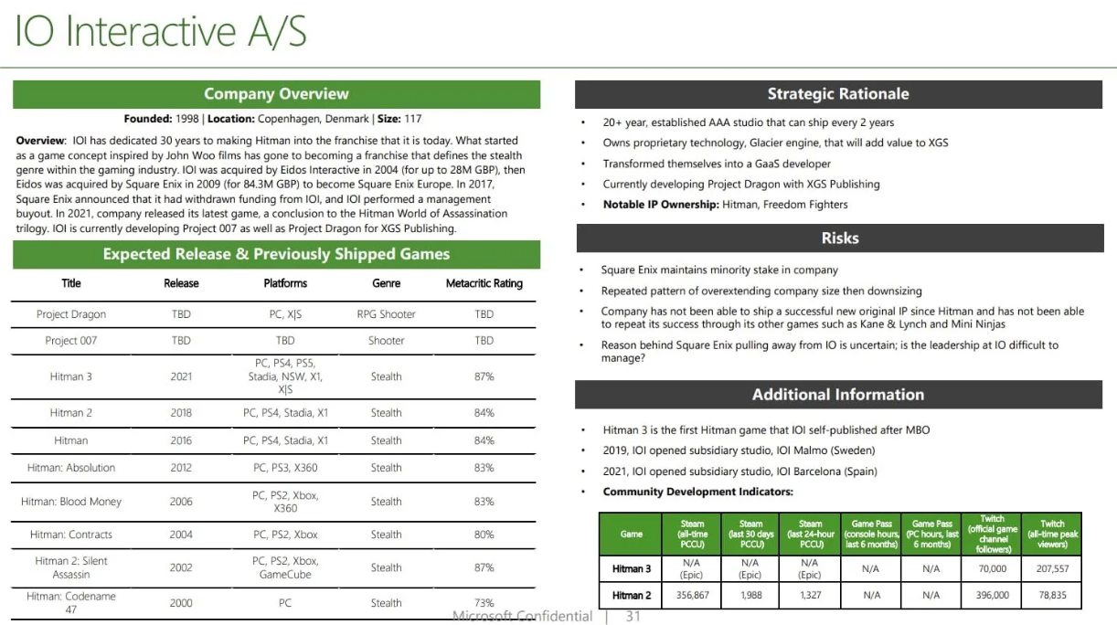 During the ongoing hearing between the FTC and Microsoft over the acquisition of Activision Blizzard, a document outlining Microsoft's internal profile on IO Interactive listed Project Dragon as one of the company's projects. In the platforms column, we see PC and Xbox Series X/S listed. Interestingly, the game is also seemingly classed as a shooter.