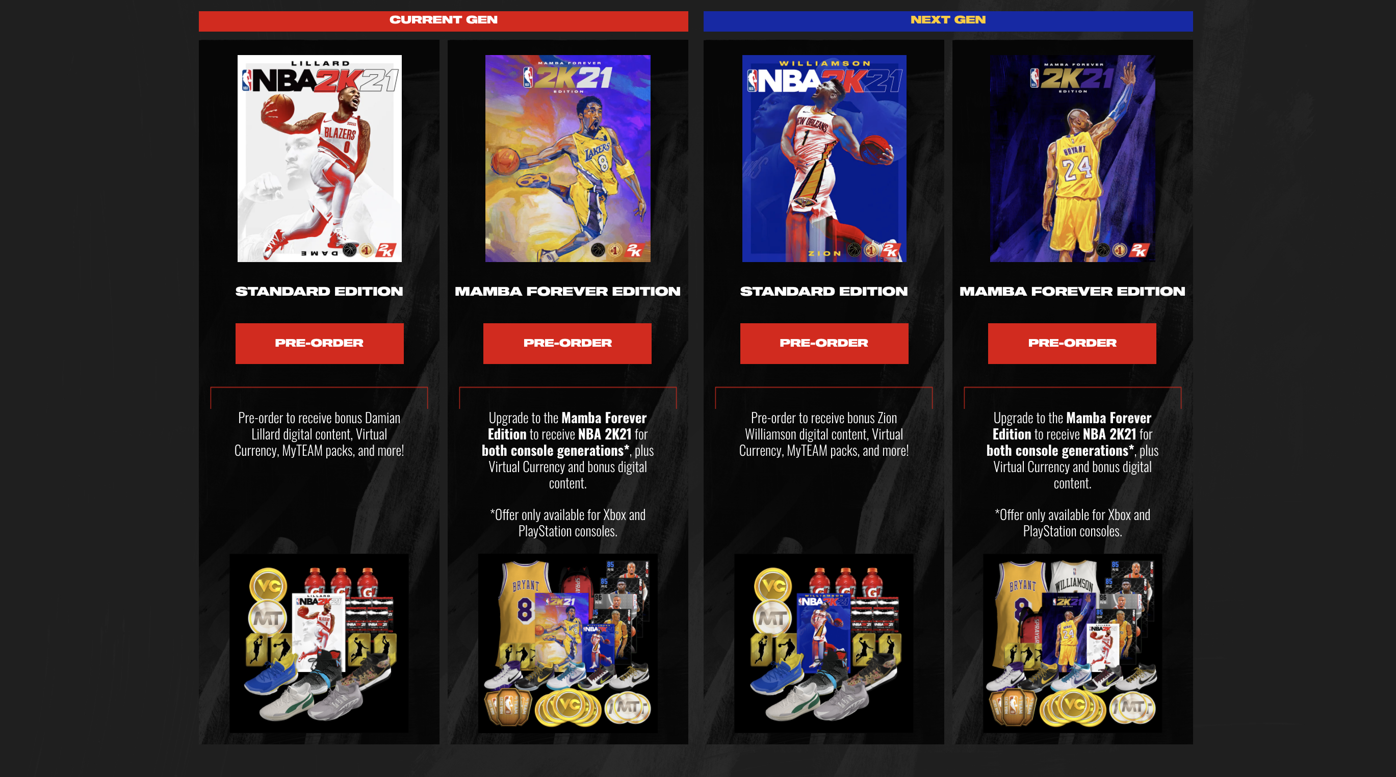 2K Games has been revealing the cover athletes and the various editions of NBA 2K21 over the course of this week. The current generation console version of the game will release at $59.99 like usual but the PS5 and Xbox Series X version will cost $69.99 instead. Then, there is also a deluxe edition, also known as the ‘Mamba Forever' edition to commemorate the passing of Kobe Bryant earlier this year. That version will cost $99.99 but will include the game for both console generations.