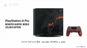 Aside from showing off more of the game, a Collector's Edition for the game was shown, including the soundtrack, artbook, a statue and fancier packaging. A Monster Hunter themed PS4 Pro was also shown and it is quite nice. I particularly like the controller design.