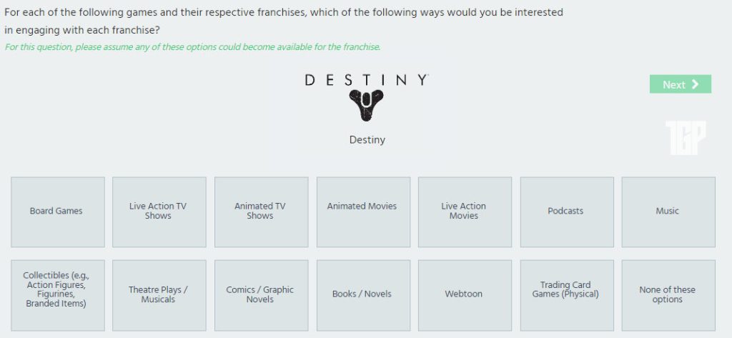 As reported by TheGamePost, Bungie recently sent out a survey to a select number of players. For our purposes, the most interesting question saw Bungie ask: “For each of the following games and their respective franchises, which of the following ways would you be interested in engaging with each franchise?”
