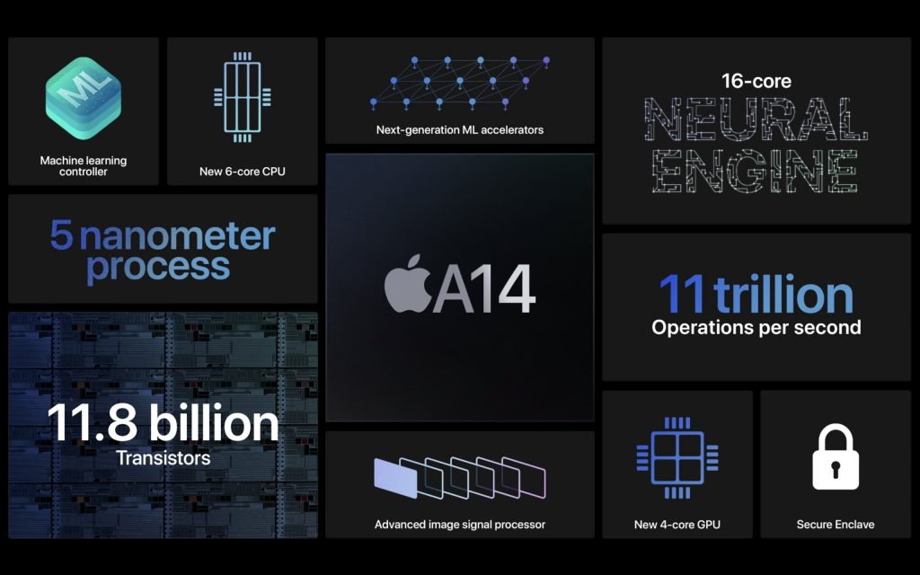 Starting with the new A14 Bionic, Apple latest SoC is based on the 5nm process node and packs 11.8B transistors. Featuring improved performance and efficiency compared to its predecessors, the 6-core CPU in the A14 offer 40% more performance and the 4-core GPU offers an improvement of 30% over the previous generation device. Additionally, the A14 comes with a 16-core neural engine capable of 11 trillion operations per second, next-gen machine learning accelerators, secure enclave, and an advanced image signal processor.