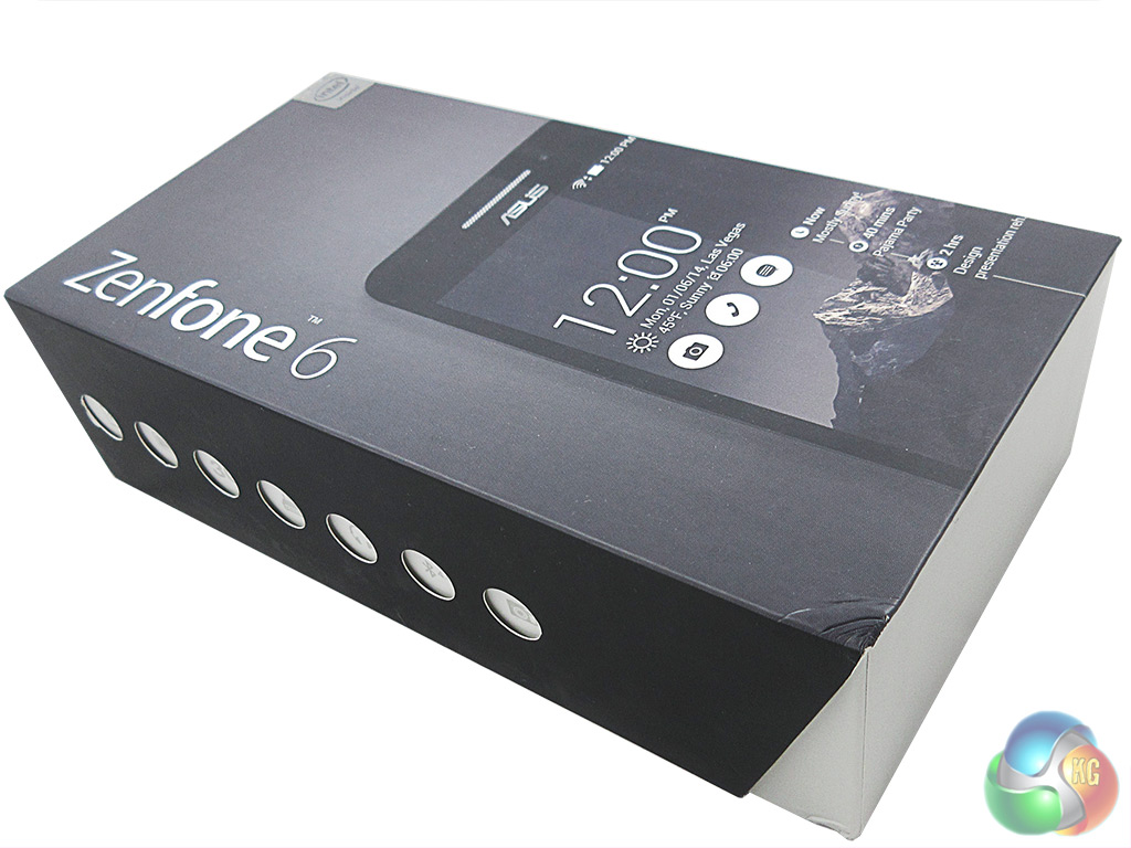 The Asus ZenFone 6 is supplied in a minimalist dark grey box, where the top slides off the box itself. A photo of the ZenFone 6 takes up most of the front.