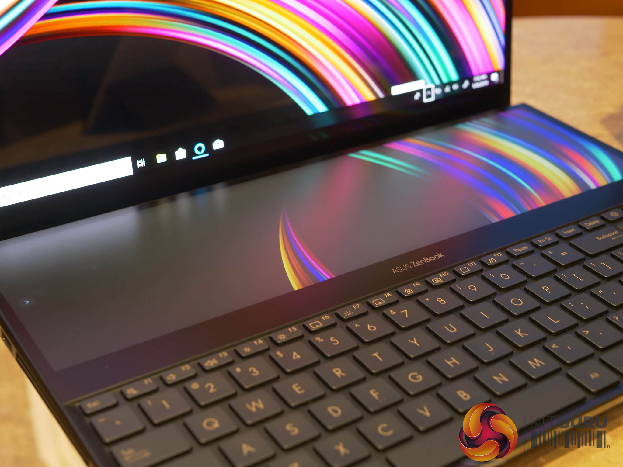 Starting with the ZenBook Pro Duo, this is a 15.6in laptop with not one, but two screens. The primary display is a crisp 4K (3840×2160) OLED touch screen, but you'll probably notice the smaller display first. This measures 14in and sits above the keyboard, with a 3840×1100 (32:9) resolution – giving you essentially half the screen real-estate of the primary screen.