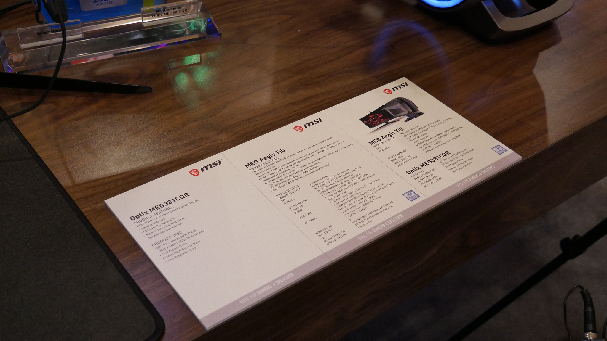 In addition to this bunch of new monitors, MSI showcased a brand new Aegis Ti5 pre-built system. The Aegis Ti5 includes the latest Intel Core i9 processors, up to Nvidia RTX 2080 Ti graphics and an abundant amount of storage bays. MSI has added separate cooling chambers to the Aegis Ti5, one specifically for the VRM solution, while the case of the Aegis Ti5 features a pull-out headset stand and a similar HMI display as the MAG381QCR monitor. The HMI can display system information in real-time and features an adjustable control knob for configuring lighting and game modes that automatically tune the system deepening what game you are playing.