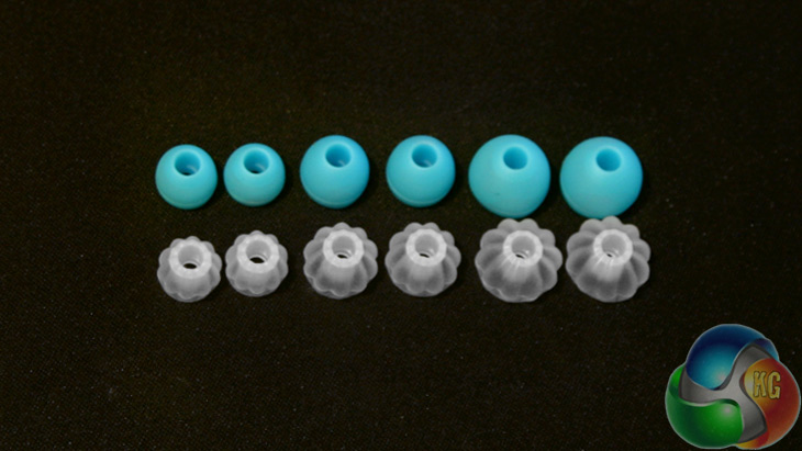 The only accessories that come with these earbuds, is a relatively large collection of alternative plugs to go over the end. There are four size options for the standard type and three with a ridged design. This is to cater to people with different sized ears, but the ridged buds also lets in a bit more outside sound than the standard set, so can make it safer for using them while out and about or running on roads.