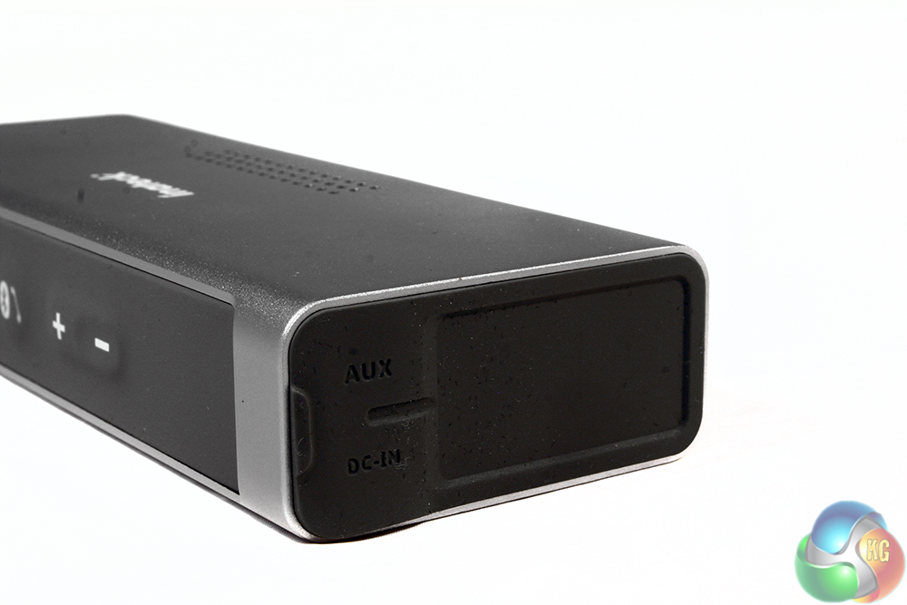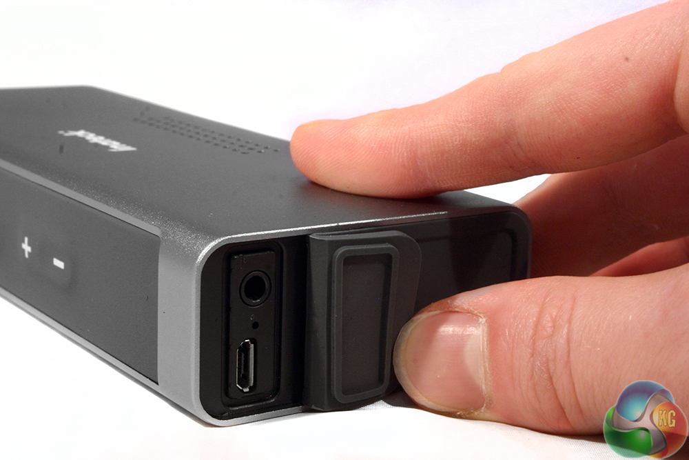 At one end of the Mercury Box you will find a rubber panel which when bent back gives you access to the micro-USB charge port and the 3.5mm audio data port for auxiliary input.