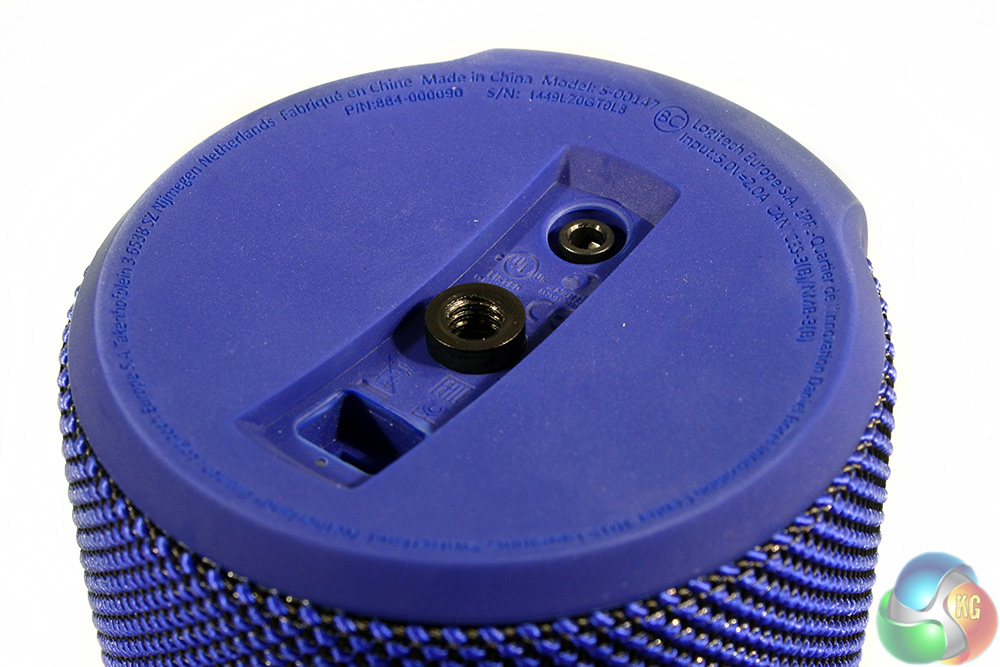 This being a waterproof speaker, there are no obvious ports or connectors. Those are found on the bottom, hidden behind a little tab that has to be unscrewed to remove. There you will find the micro-USB connectors and a 3.5mm connector should you wish to hardwire a device that does not have a Bluetooth connection.