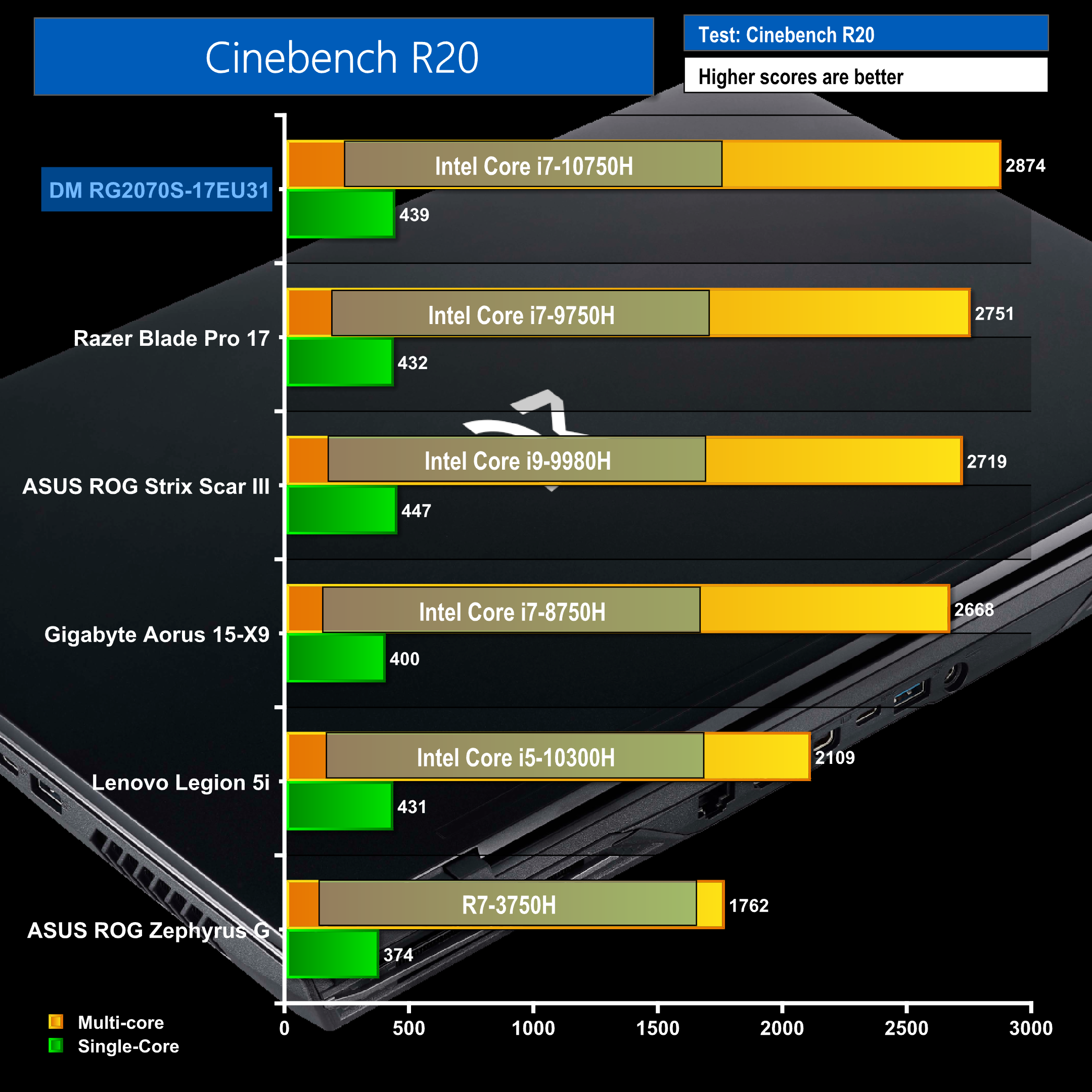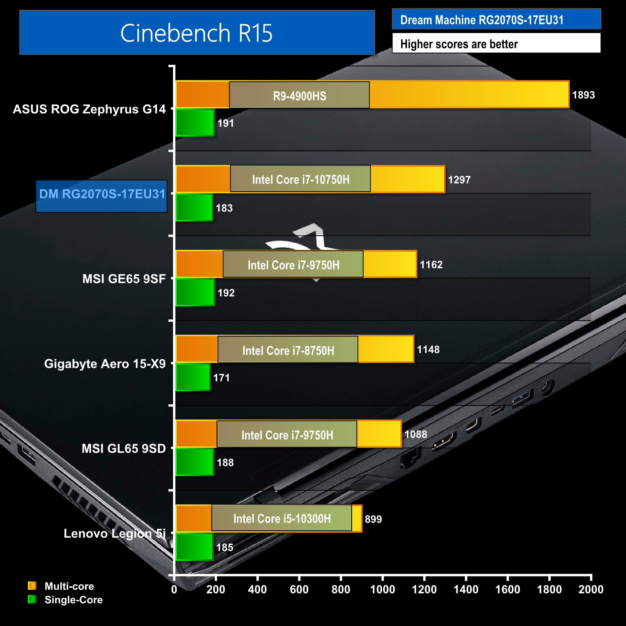 Cinebench R15 and R20 are tests that measure CPU performance. Cinebench R15 and R20 shows us the i7 performs very well, scoring second place in R15, only beaten out by a Ryzen 9 and coming first in R20.