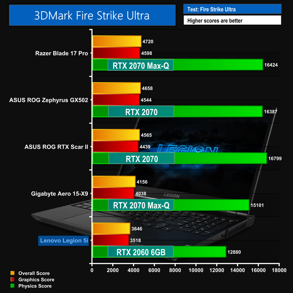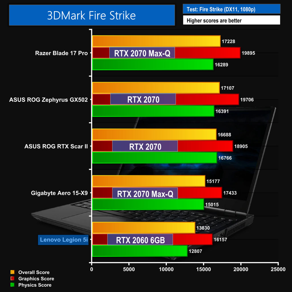 Placing last in every test doesn’t actually make the Legion a loser! Our 2060 is up against 2070 Max-Q and Max-P GPUs, considering this the scores are very close and what we expected to see here from a 6GB RTX 2060.
