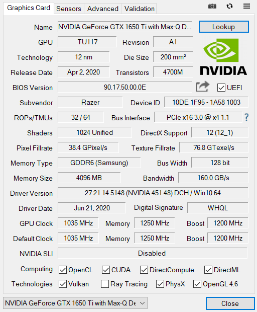 - GPU: NVIDIA GeForce GTX 1650 Ti 4GB GDDR6 VRAM with Max-Q design