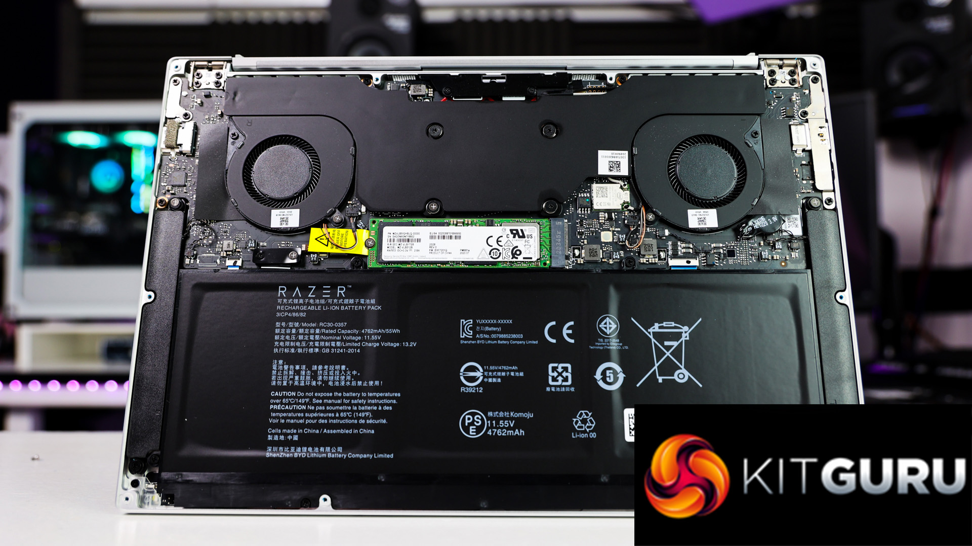 Inside the Book 13 we can see a 55WHr battery as well as the Samsung PM981a OEM-only SSD, which is accessible so you could always swap this out if you really wanted to. The RAM is soldered on so there’s no accessible SODIMM slots therefore you can’t upgrade these in future. Finally, we can see Razer are using a vapour chamber for the CPU cooling too and they often use this on their other laptops.