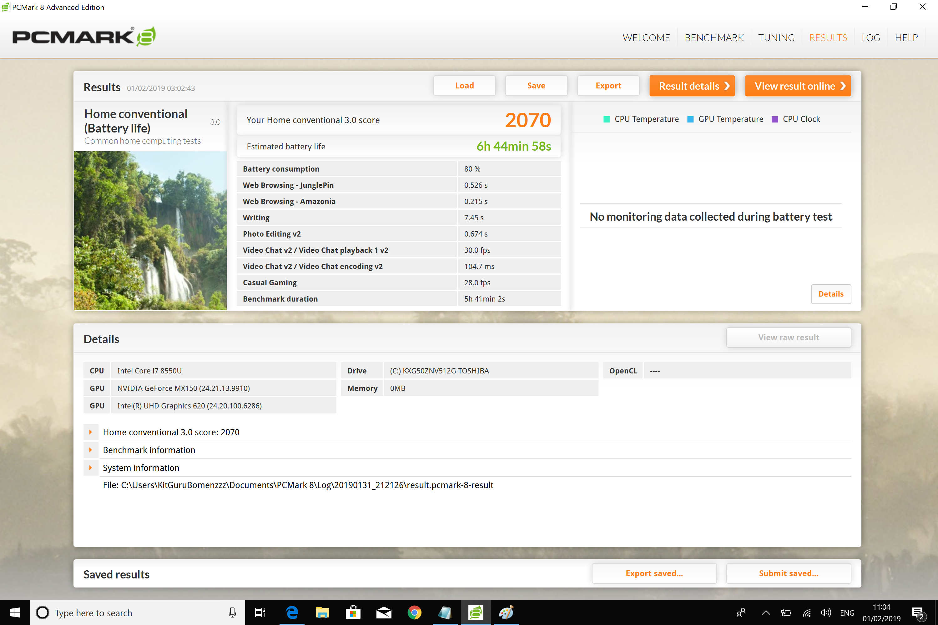 I tested the battery life on this laptop using the ‘Home Conventional' benchmark in PCMark8. Once I had set the screen and keyboard brightness to 100%, I left the benchmarking process on overnight to find out the results.