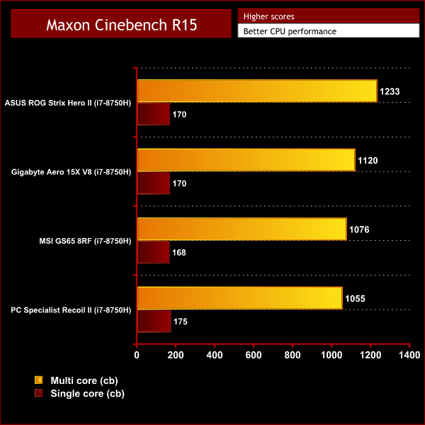 Cinebench R15 is a cross-platform testing suite that measures CPU performance. We compare the ROG Strix Hero II with some other laptops we have tested that feature the same processor for a quick comparison to demonstrate its relative performance.