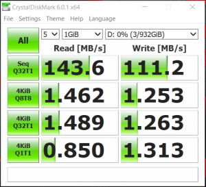 CrystalDiskMark tests the raw speed of a storage device. It uses a test file to write data to or read data from the drive. We test using the default 1GB file size.