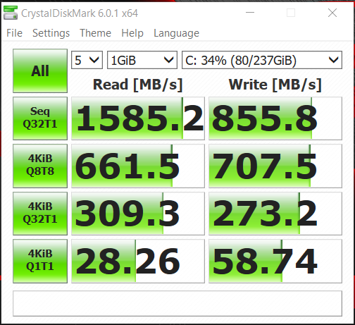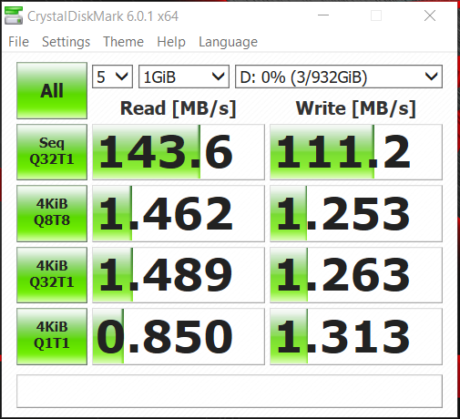 CrystalDiskMark tests the raw speed of a storage device. It uses a test file to write data to or read data from the drive. We test using the default 1GB file size.