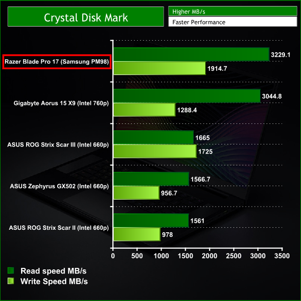 The Samsung PM98 NVMe M.2 drive that can be found in this laptop is a very fast drive that beats out many of the other laptops Kitguru have tested. This is good to see as we have seen other laptop manufactures putting sub par storage even in high end machines. With such fast read and write speeds everything you ask of the Razer blade feels snappy and responsive great for handling large programs and files.