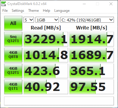 CrystalDiskMark tests the raw speed of a storage device. It uses a test file to write data to or read data from the drive. We test using the default 1GB file size.