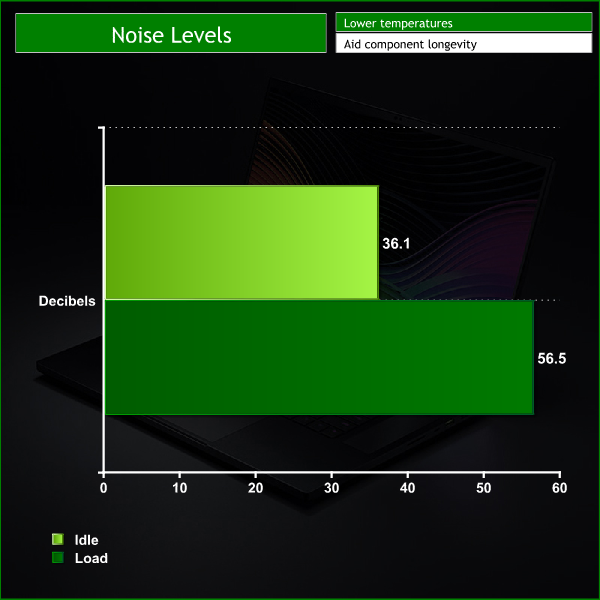 I found the noise levels on the Razer blade to be very impressive. Gaming laptops can be loud, hot and bulky but Razer seem to have perfected the cooling in a very thin chassis. An idle decibel level of 36.1 is whisper quiet and to me the fans were barely audible while idle. Under load the fan noise noticeably increases but it is far from the loudest laptop I've heard and to me it's acceptable. The speakers are loud enough to drown it out and I could not hear it when gaming with a headset.