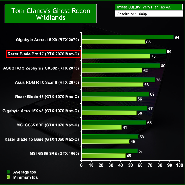 Tom Clancy’s Ghost Recon Wildlands is a game with a superb open world environment. The beautiful scenery of mountains, forests and deserts requires a lot of GPU power to render, particularly on high settings. This demanding game is perfect for testing this laptops gaming performance. I tested on very high settings with AA disabled.