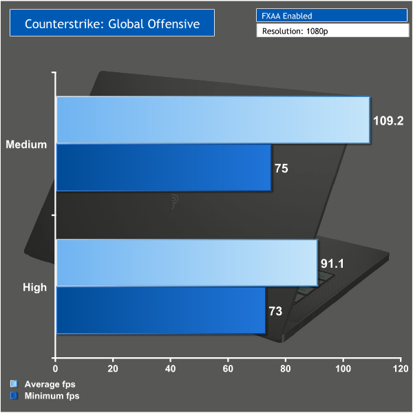 CS:GO ran perfectly on this laptop even on the highest settings and the minimum fps stayed well above 60.