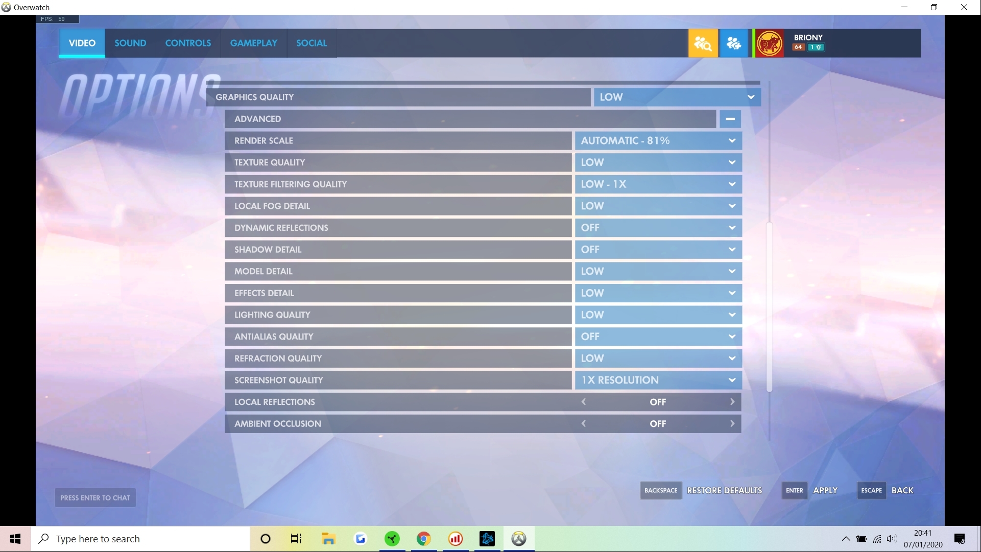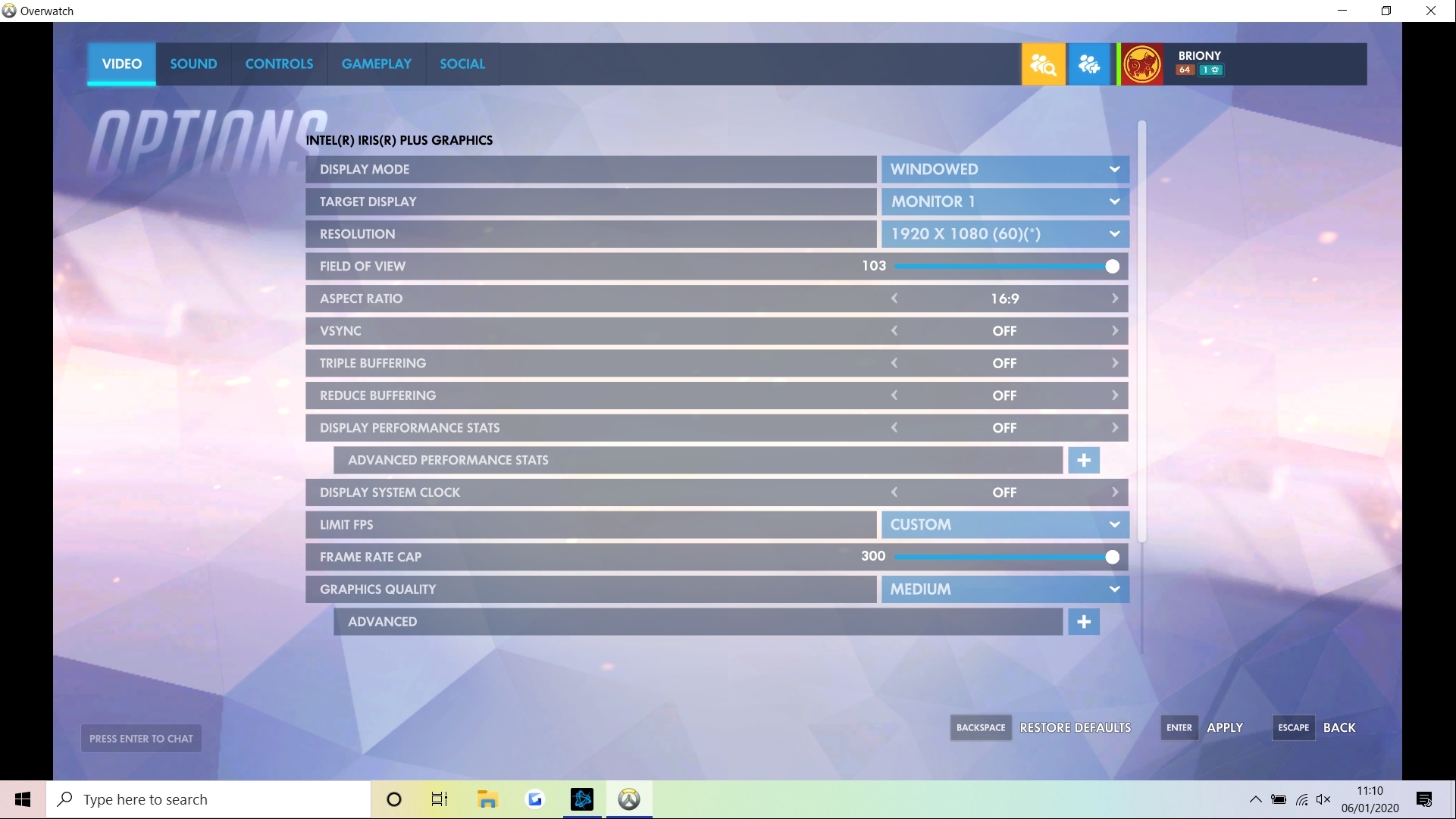 Overwatch is a more demanding game and does push this laptop that bit harder. I set the resolution to 1080p but decided to keep the graphical settings low.