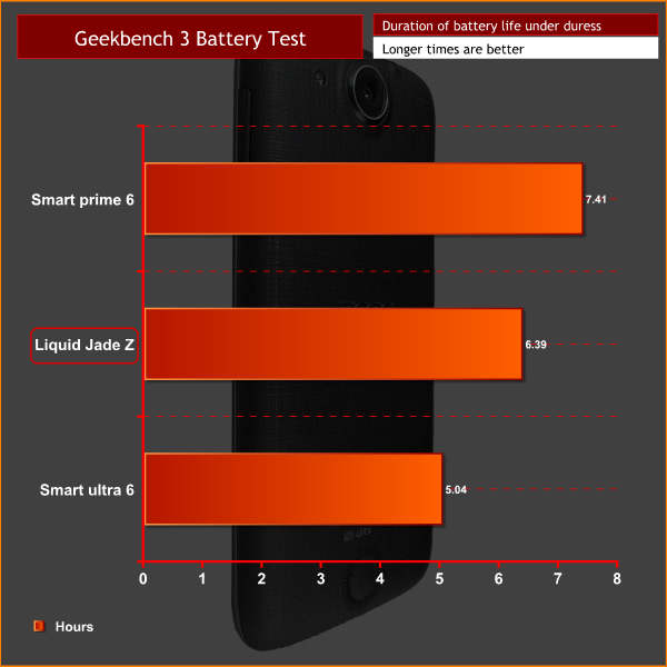 This is more-or-less confirmed by the Geekbench 3 battery benchmark. The Jade Z lasted for 6 hours 39 minutes, behind the Smart prime 6 but well ahead of the Smart ultra 6. This indicates solid battery life under duress.