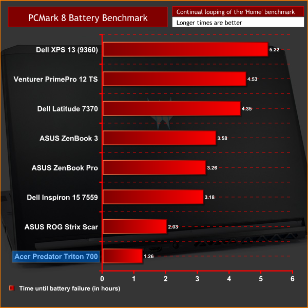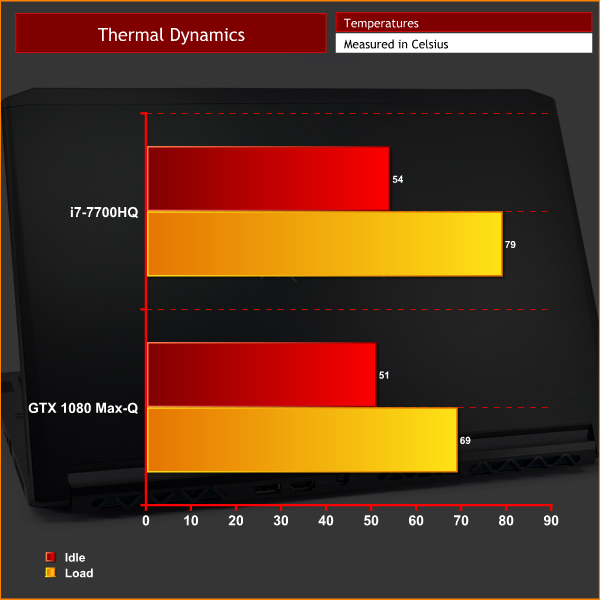 For such a small laptop, the Triton 700 delivers very impressive cooling performance. A peak CPU temperature of 79C is around 15C less than what we typically see with a thin laptop chassis, so brilliant work there from the Acer engineers.