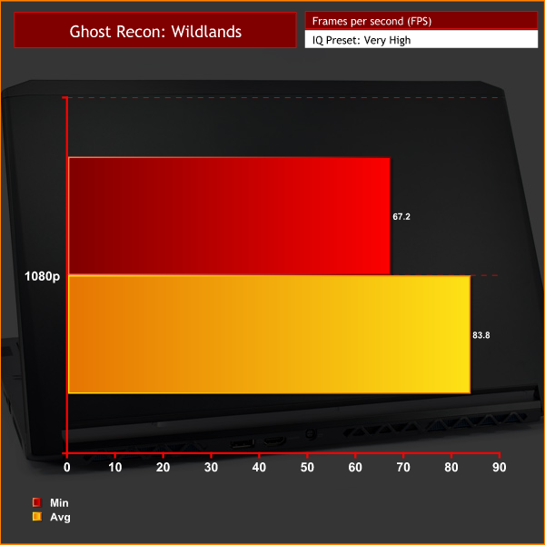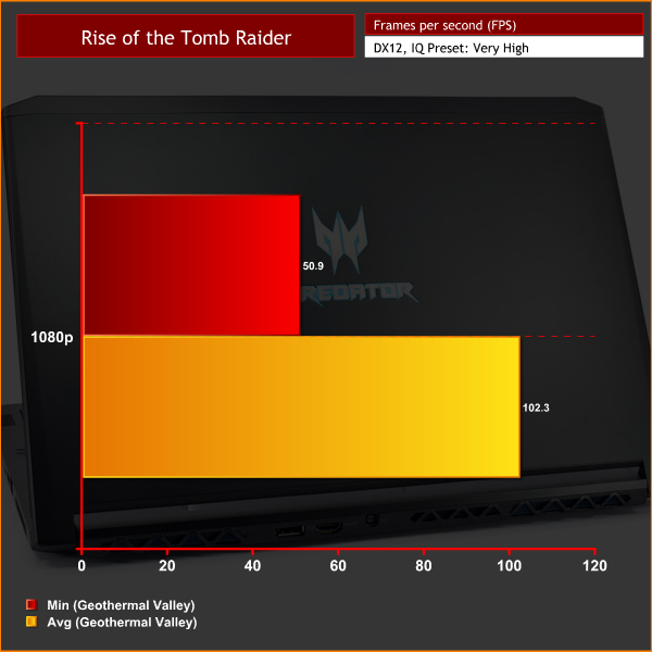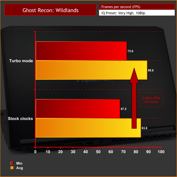 The GTX 1080 can also be overclocked using Acer's Predator Sense software. I enabled the ‘turbo' graphics boost mode and re-ran a couple of benchmarks. In Ghost Recon Wildlands, turbo mode gave an extra 5 FPS on average (or 6% extra frames) – and considering there was hardly any extra noise, this is well worth doing.