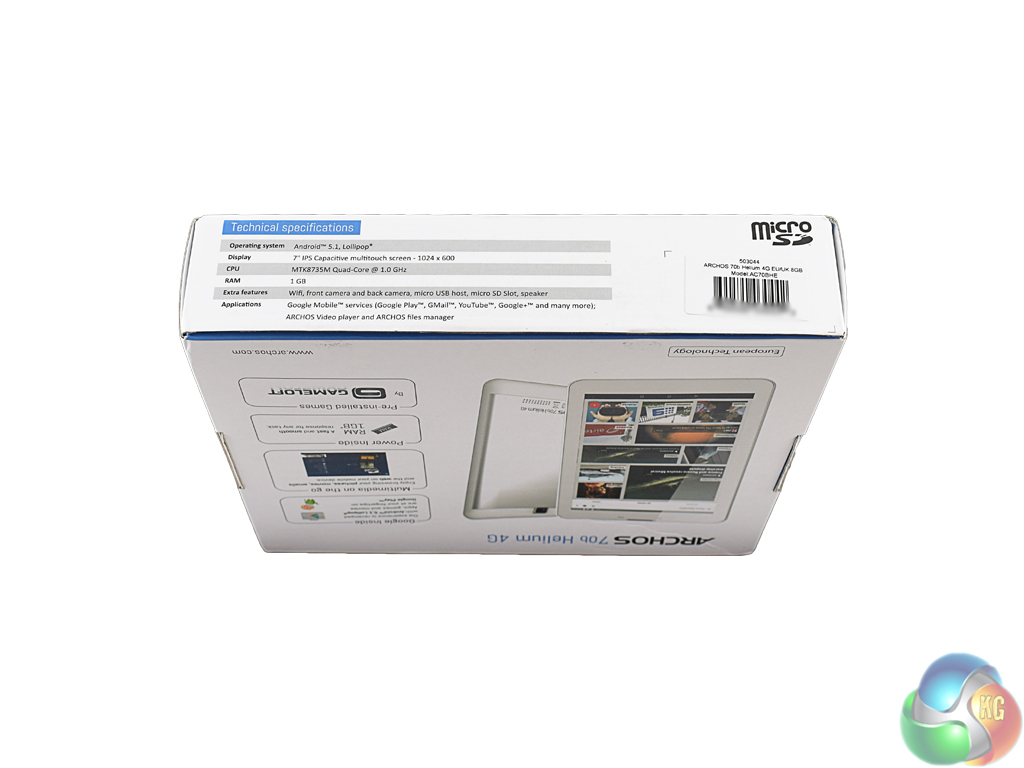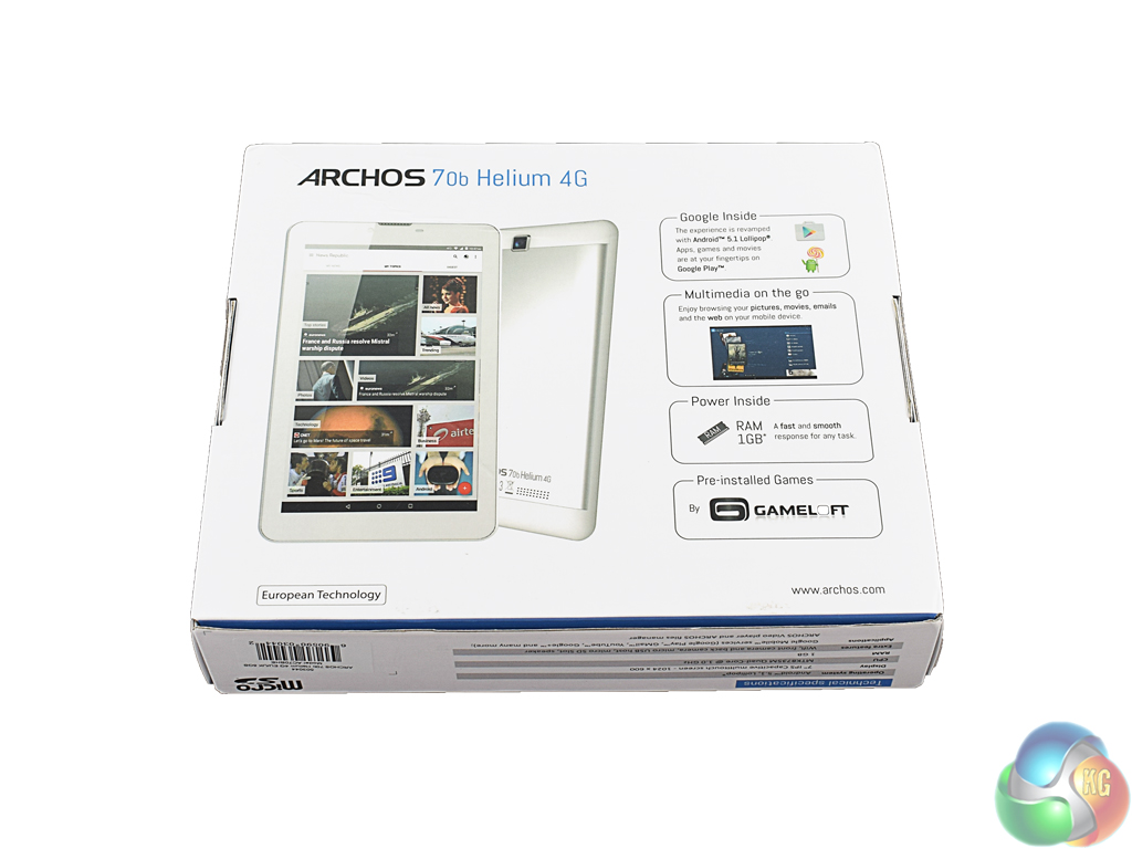 The ARCHOS 70b Helium ships in a fairly standard box, with the front showing the tablet itself and some key specs.