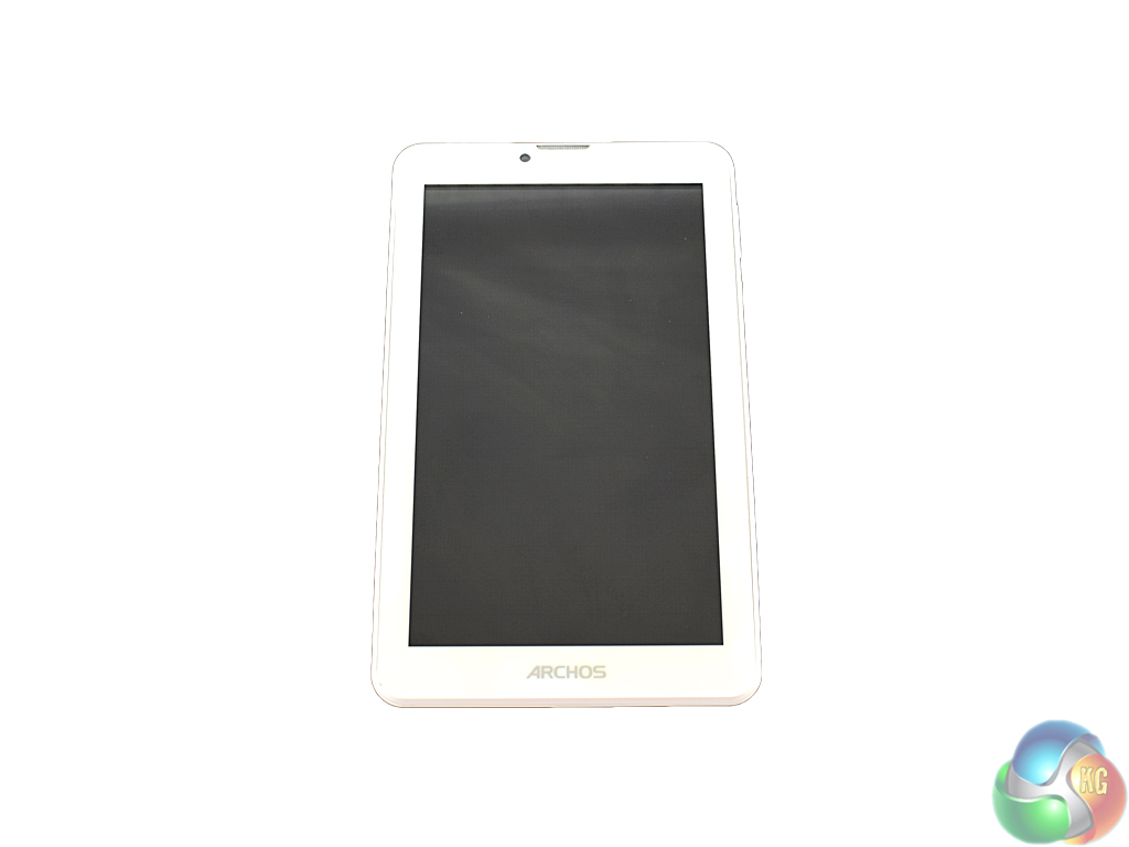 The front bezels are fairly thin, too, and there is a discrete ARCHOS logo at the bottom of the device. The 0.3MP selfie camera is visible at the top, along with the front speaker.