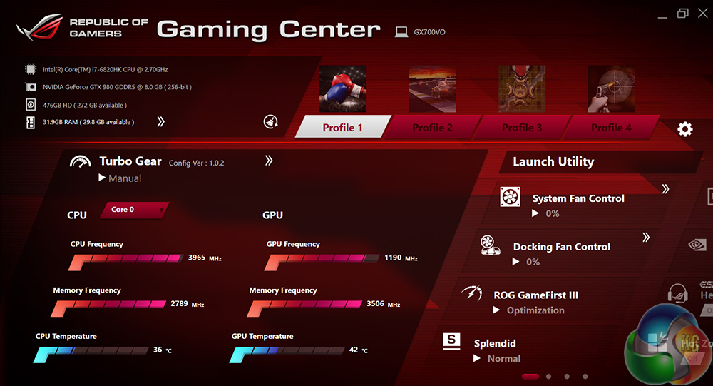 Overclocking is possible in the Gaming Center, though – a novelty for a laptop. Above you can see the setting I used to overclock the GX700. It is also worth pointing out that the GX700 can only be overclocked when engaged with the watercooling dock.