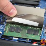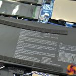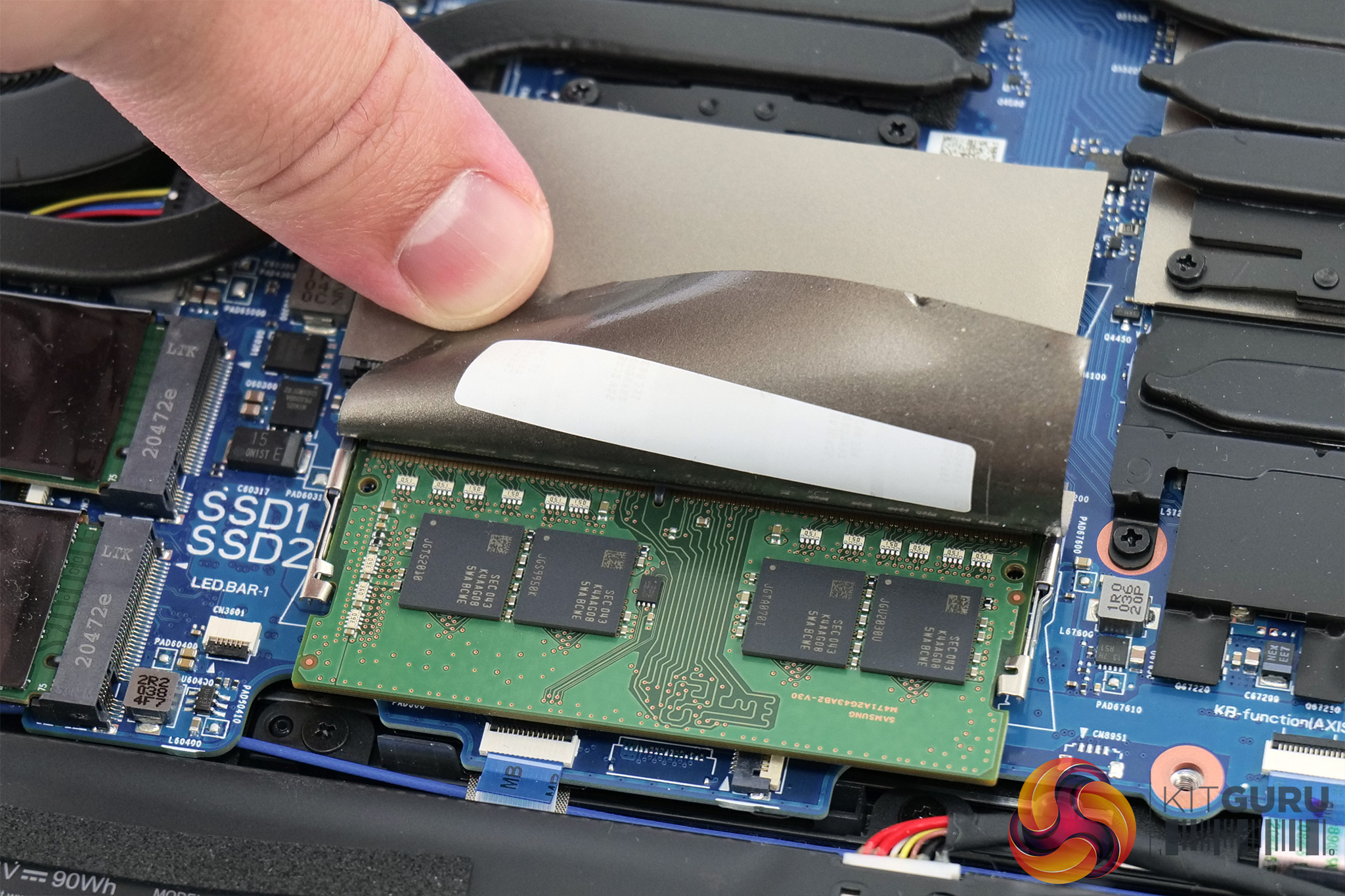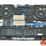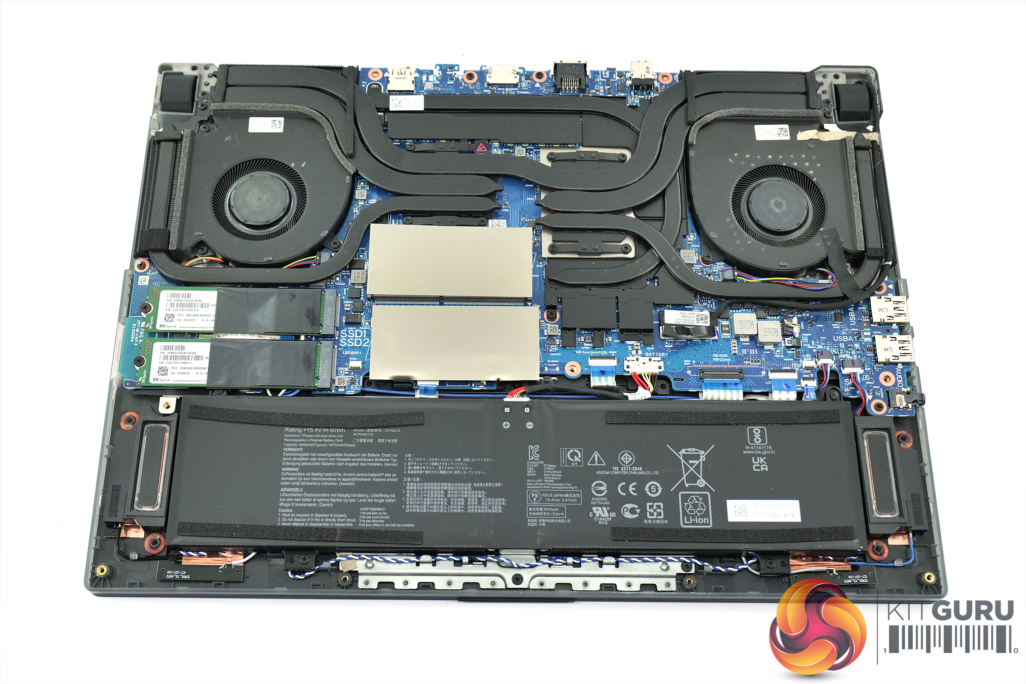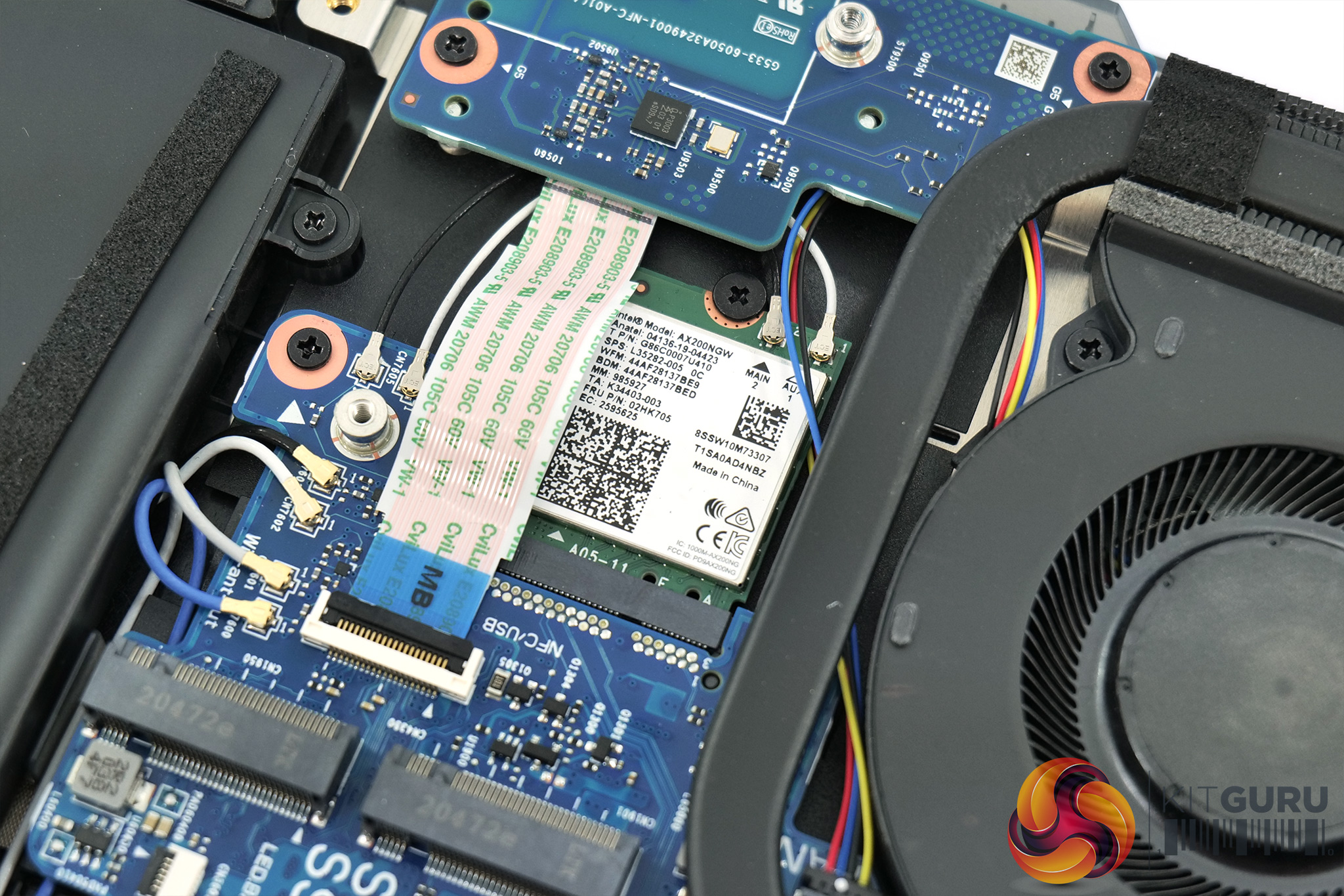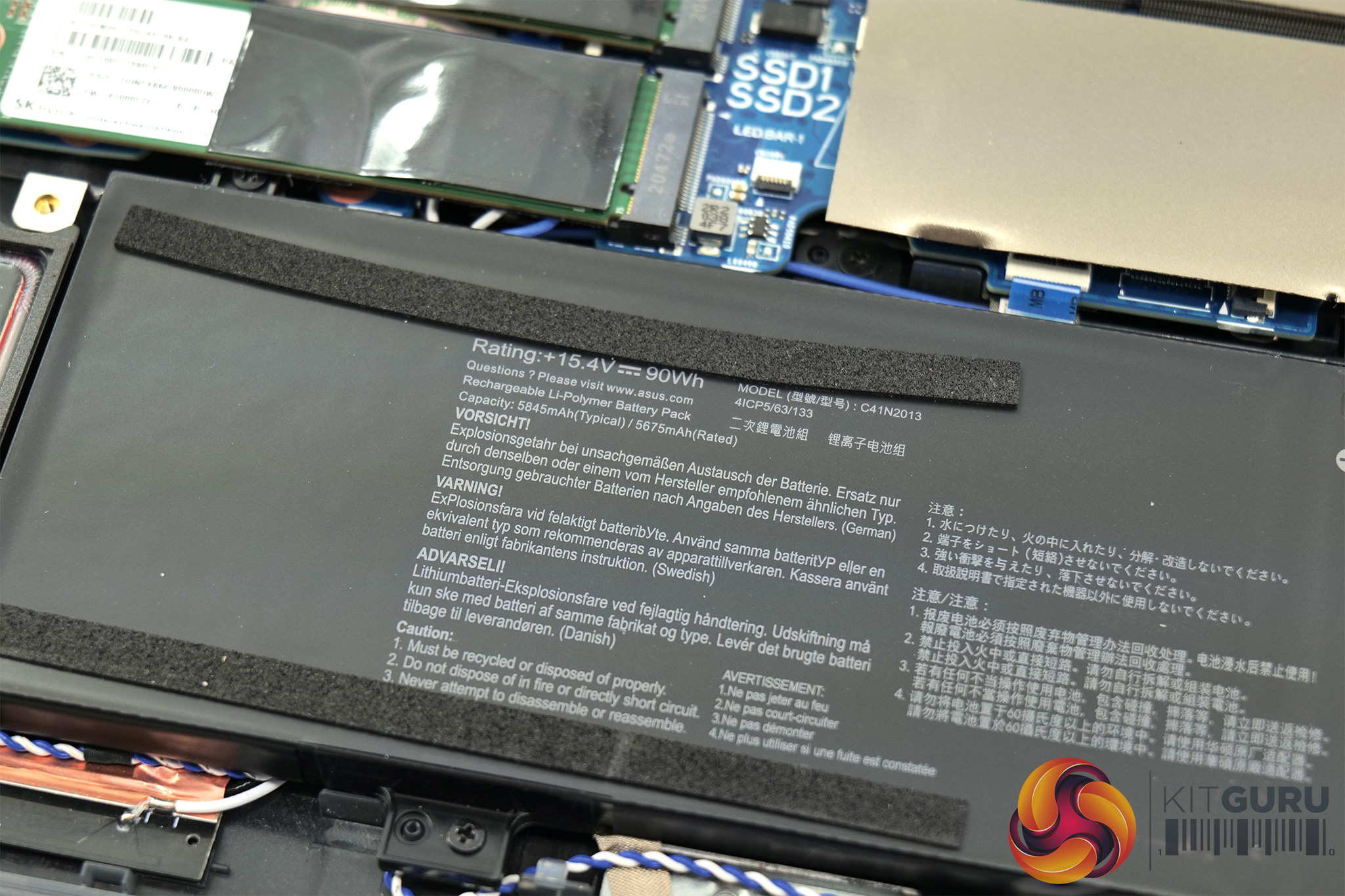 Moving on to look at the internals, if you do open up the Scar 15 it's important to note that two thin (and fragile) ribbon cables run from the motherboard to the underside panel itself, so caution is advised when removing said panel. After that, we can note the 90Whr battery as well as the two SK Hynix BC711 1TB SSDs, configured in RAID 0. There's also two 16GB DDR4 modules from Samsung, while ASUS is using Intel's AX200N WiFi 6 module.
