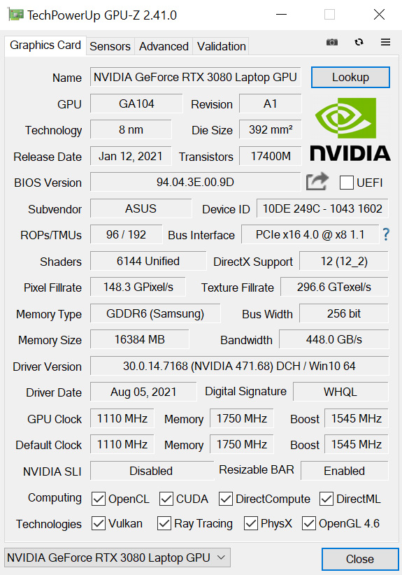 - Graphics:NVIDIA® GeForce RTX™ 3080 Laptop GPU, with ROG Boost up to 1645MHz at 115W (130W with Dynamic Boost) 16GB GDDR6