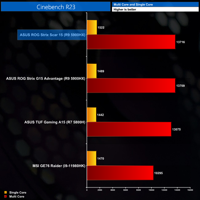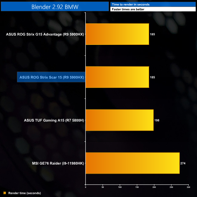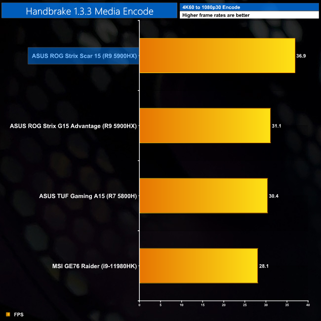 We see similar, but overall slightly better CPU performance from the Scar 15's 5900HX than that of the Strix G15 Advantage, which seems to be down to the Scar's ability to maintain higher all-core clock speeds under load. The Handbrake media encode is also a fair bit faster, but the 32GB DDR4 memory – with seemingly higher quality modules than the G15 – also helps matters here.