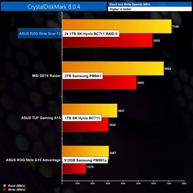 It may not be as optimal as a single PCIe Gen4 SSD – both because of long-term reliability and the fact that a single 2TB PCIe 4.0 SSD would leave a second slot for future upgrades – but the 2x 1TB SK Hynix BC711 drives, configured in RAID 0, really deliver the goods in our sequential read/write speed test.