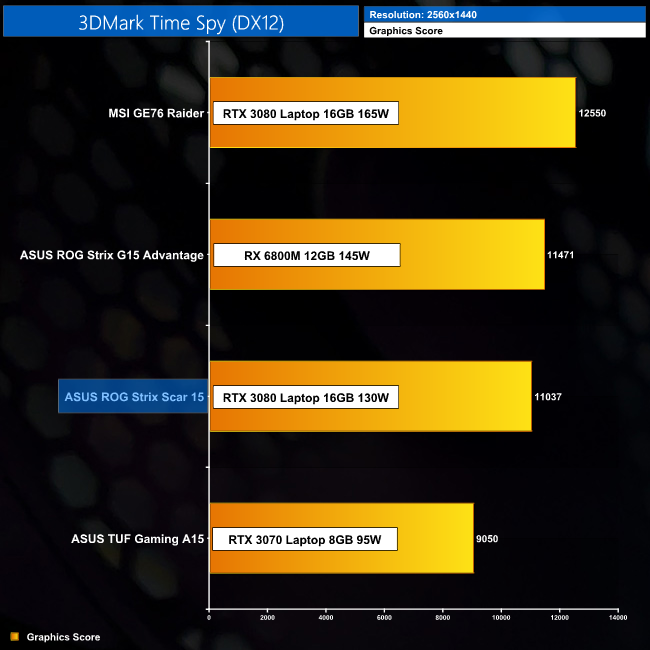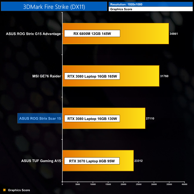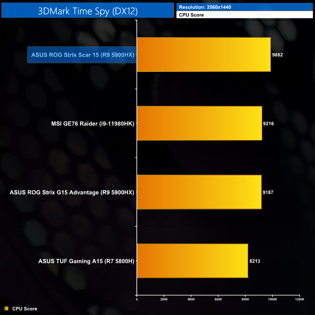 3DMark performance is pretty much where we'd expect. The RX 6800M wipes the floor with the competition in Fire Strike, but Time Spy is a much closer affair and the Scar 15's RTX 3080 Laptop GPU is only just behind. Meanwhile, for the Time Spy CPU test, the 5900HX used in the Scar 15 is again able to out-pace the same CPU found in the G15 Advantage, likely with some help from its superior memory modules.