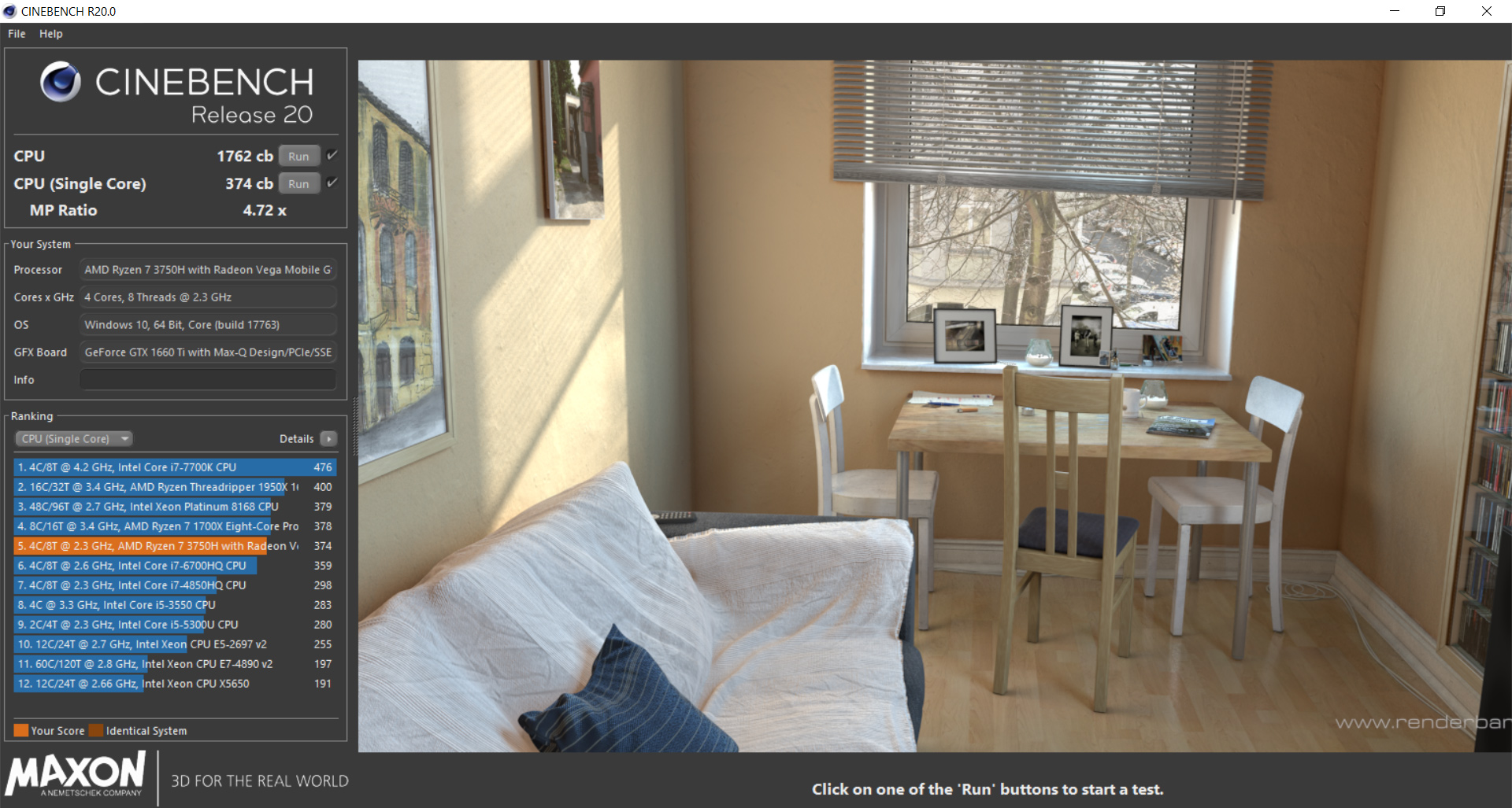 Cinebench R15 is an application which renders a photorealistic 3D scene to benchmark a computer’s rendering performance, on one CPU core, all CPU cores or using the GPU. We run the test using the all-core mode.