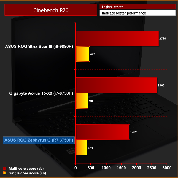 Cinebench R20 is a recent release so we are still building up our comparison data for this new benchmark. Here, the Ryzen 7 3750H is about 34% slower than the i7-8750H in terms of multi-core performance, though single-core performance is within 7% of that Intel chip.