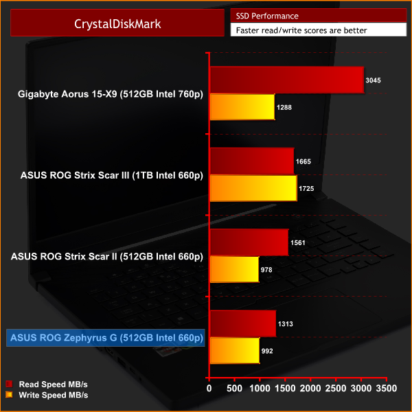 A lot of ASUS ROG machines we have reviewed recently use the Intel 660p SSD, though the 512GB model here is really not that fast for a NVMe drive. It's still faster than a SATA drive, yes, and we have to remind ourselves this isn't a high-end gaming machine.