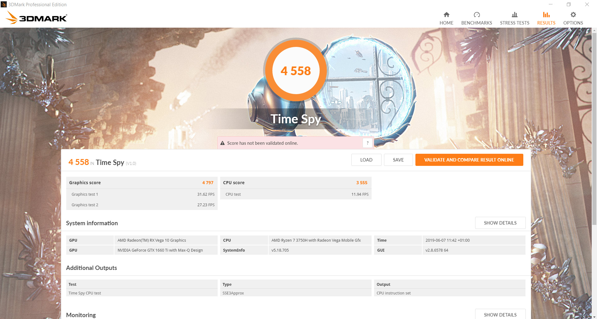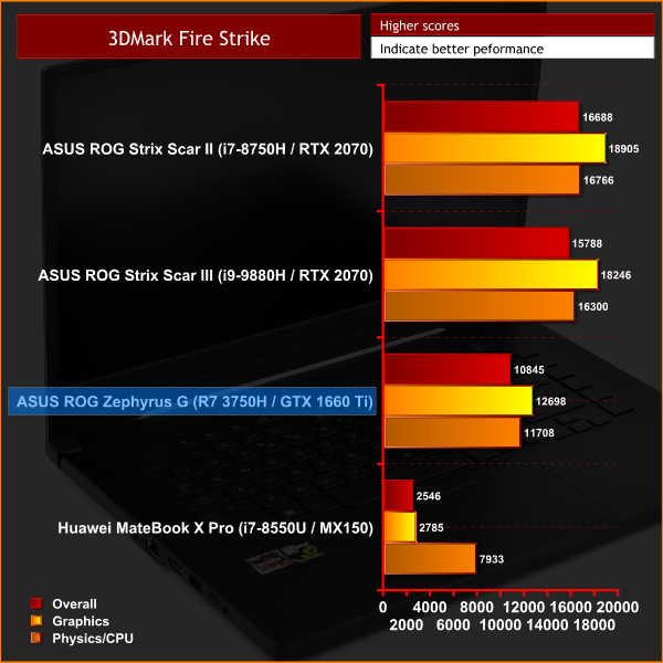 The Zephyrus G posts healthy benchmark scores in both the Fire Strike (1080p DX11) and Time Spy (1440p DX12) benchmarks. Looking first at the graphics score from Fire Strike, the machine posted a result of 12698. Compared to a desktop GTX 1660 Ti – like this Gigabyte OC 6G model – this is around 3400 fewer points, though we have to remember this is both a Max-Q chip and it is paired with a mobile processor. Even so, it's still a decent score considering both those limitations.