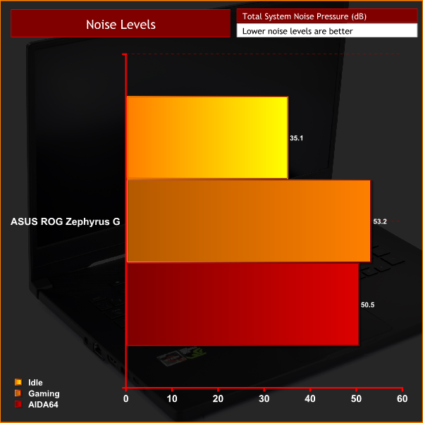 There's no getting around the fact that the Zephyrus G is a loud machine. We noticed a 3dB variation between our gaming and AIDA64/3DMark tests, but either way – it's a very noticeable fan noise. When idling it's almost inaudible, but as soon as you open a game the fans ramp up quickly. Unlike the Strix Scar III, however, I found the fan speed to be pretty consistent – it didn't oscillate once the system came under load – but you'll definitely want to wear a headset when gaming with this machine.