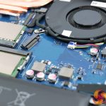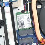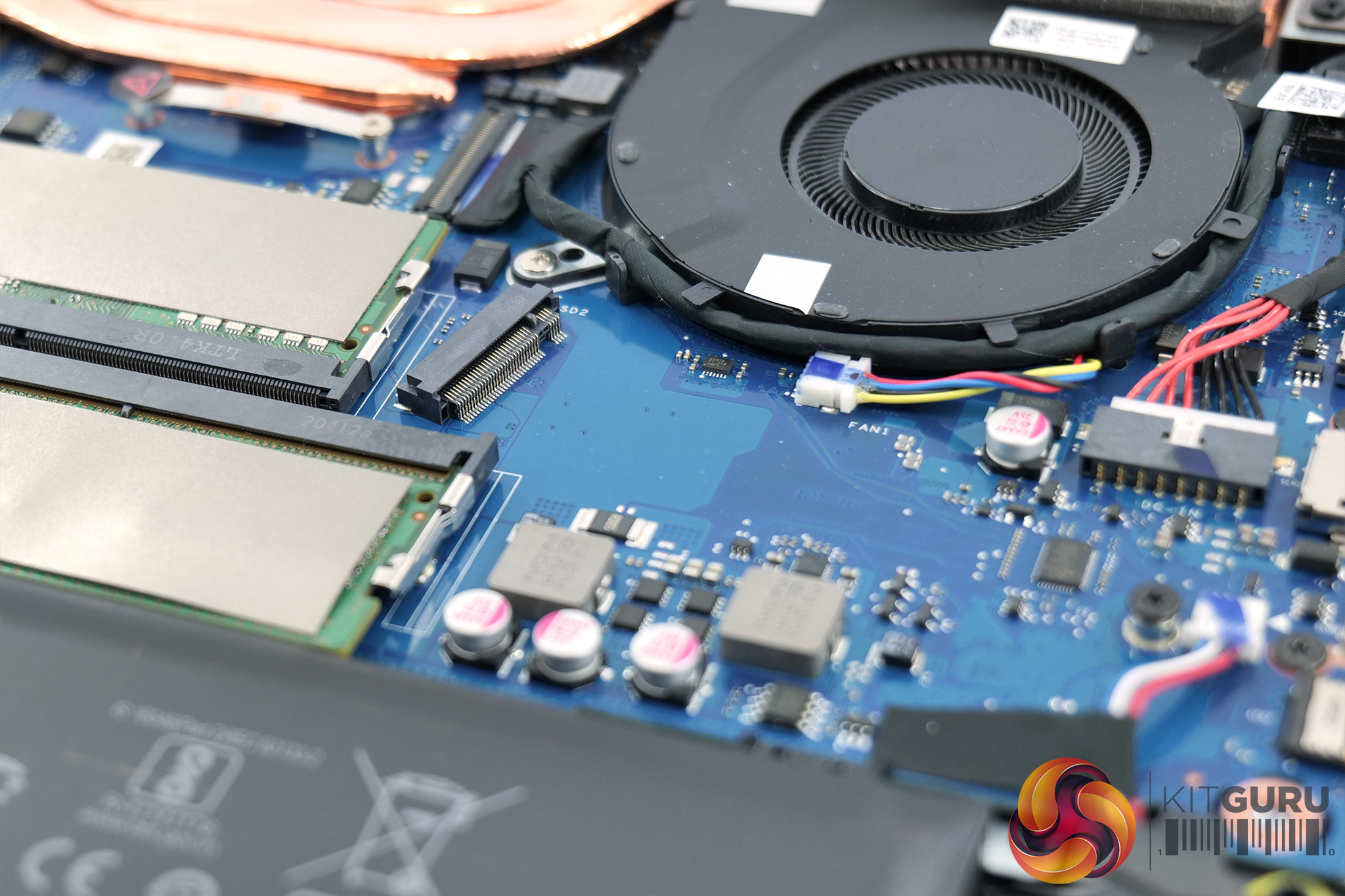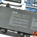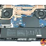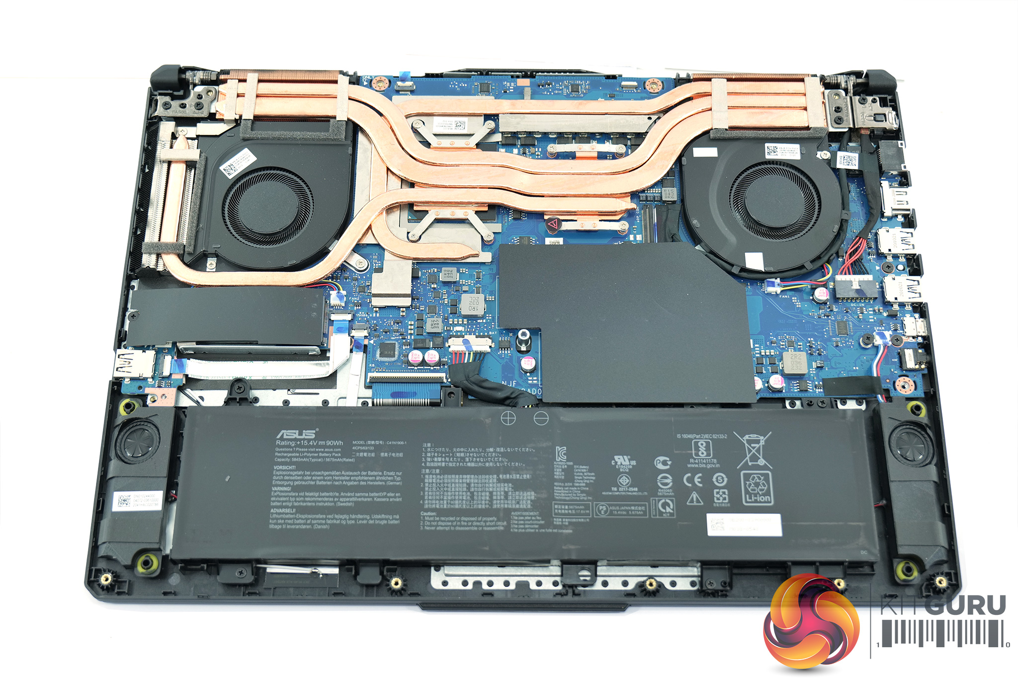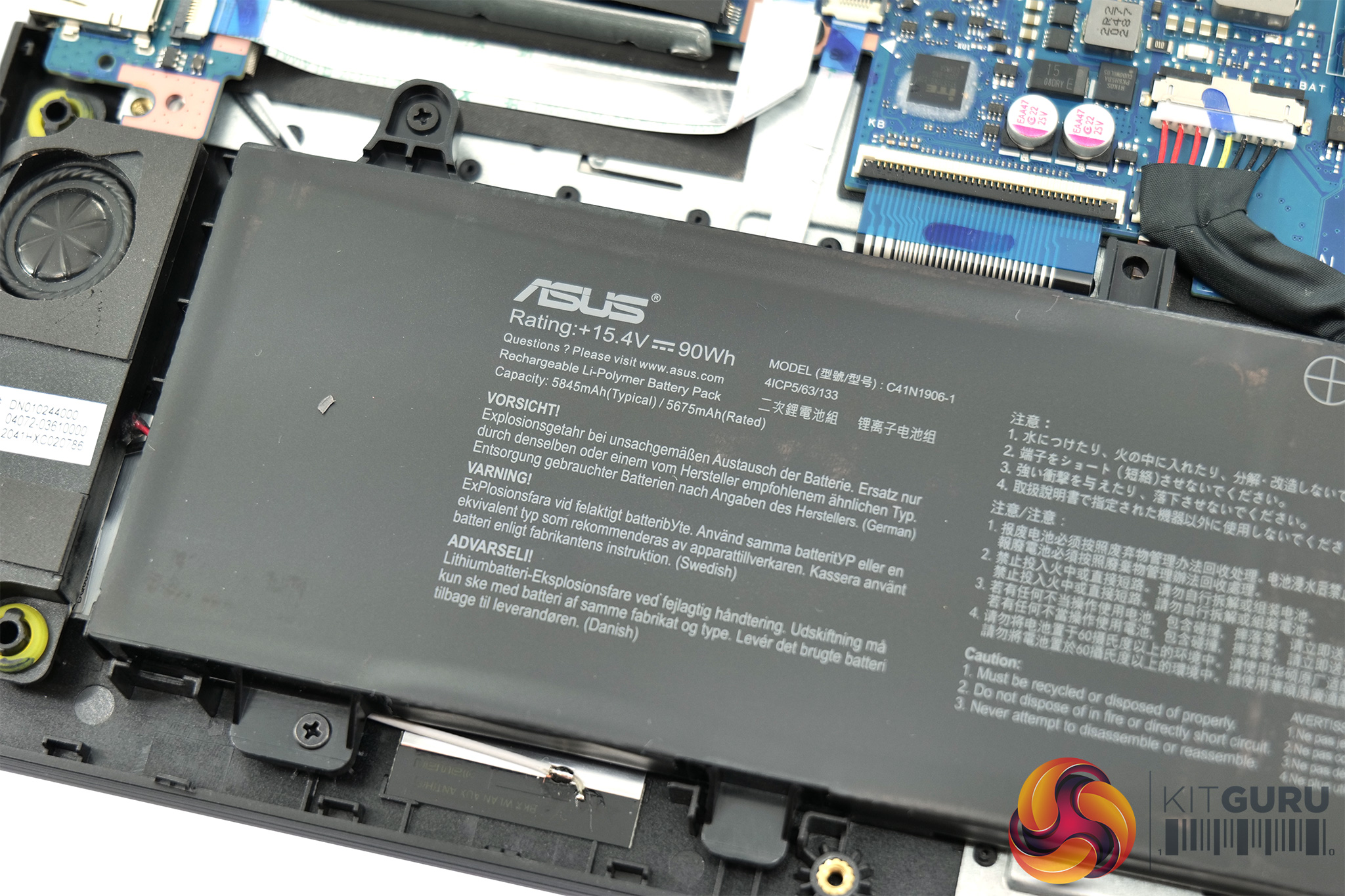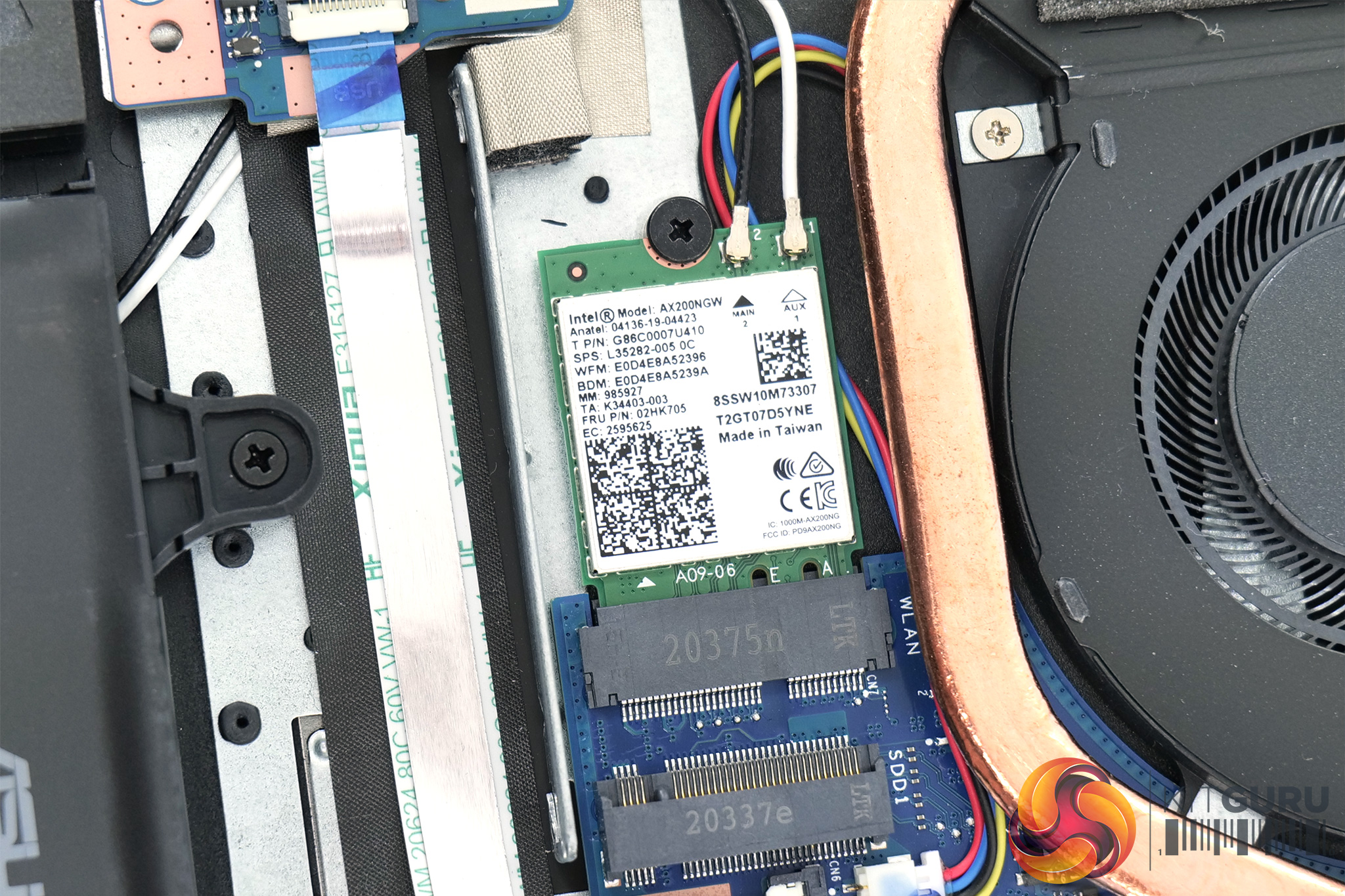 We can also note a few key areas with the internal design. ASUS is using a large 90Wh battery, alongside two SODIMM slots, both of which are occupied by 8GB DDR4 3200MHz modules. The included SSD is a 1TB M.2 SK Hynix BC711, but do note this is a PCIe 3.0 drive, so don't expect speeds over 4GB/s. There is, however, a spare M.2 slot, set at a 45-degree angle from the memory. It's a bit unusual looking, but provides an easy way to stick in more storage down the line. Lastly, we can also note Intel's WiFi 6 AX200 module positioned underneath the SK Hynix SSD.
