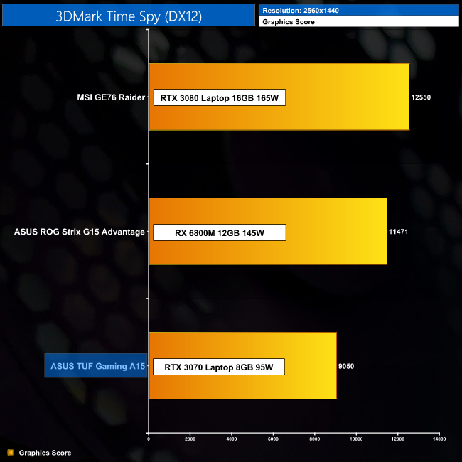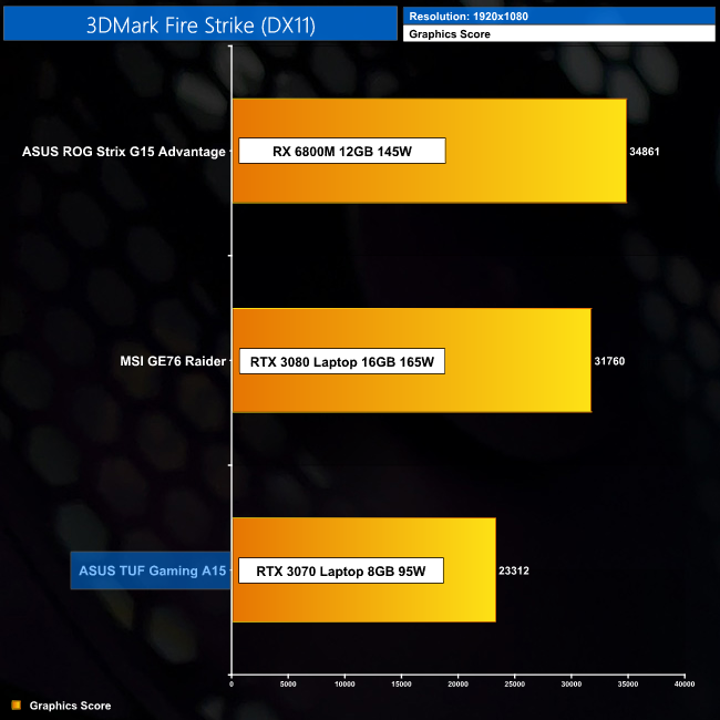 Our 3DMark scores show the TUF Gaming A15 sitting bottom of the pile, though we are comparing to two more expensive machines. The 95W RTX 3070 can't keep up with the RX 6800M in either Fire Strike or Time Spy, while the Ryzen 5800H also slows down in the CPU test in Time Spy. Let's see what that means for our game benchmarks…