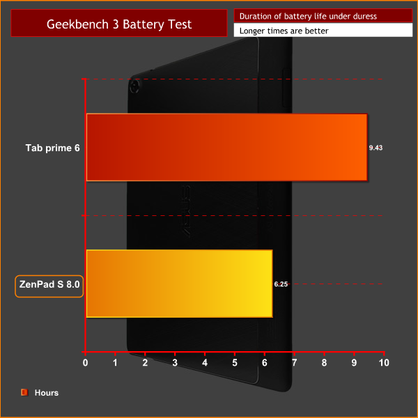 The Geekbench 3 battery benchmark only confirmed this. The ZenPad S 8.0 lasted 6:25, well below the time posted by the Vodafone Tab Prime 6. Clearly, the 4000 mAh battery is just not enough for the high resolution display.