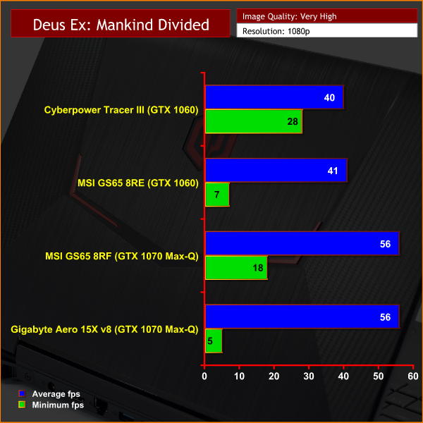 In games, though, the Tracer III proves to be 1-4 FPS slower than the GS65. This is because the GTX 1060 in the Tracer III would boost to around the 1550-1570MHz mark, whereas the GS65's GTX 1060 was running approximately 100MHz faster. This is a bit of a shame considering the Tracer III is thicker than the GS65, so we would've expected it to have increased thermal headroom, thus allowing for the GPU to take its core frequency higher than what we saw. Unfortunately, this did not pan out – though overall performance is still more than acceptable.