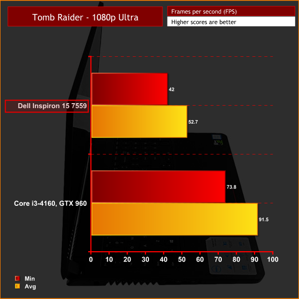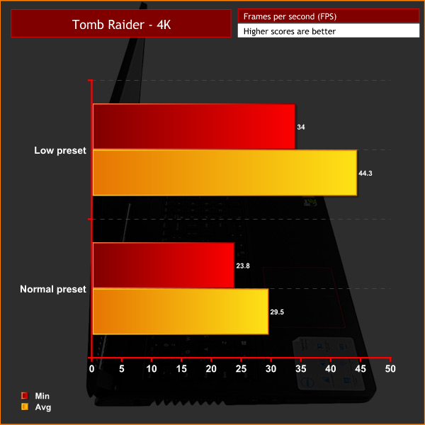 Above you can see the 1080p results using the ‘ultra' preset. Clearly, the Inspiron is able to handle Tomb Raider at 1080p, but how about 4K? Below we put it to the test.