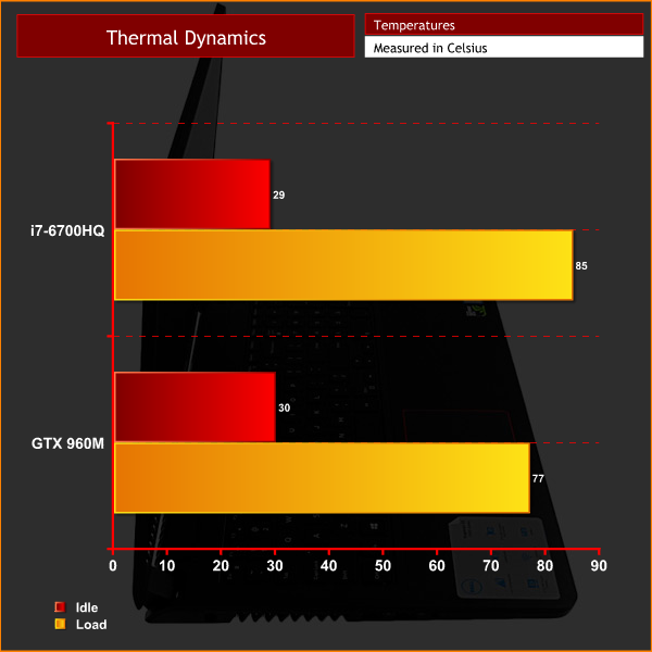 In terms of acoustics, the Inspiron cycles between 5 levels of fan speed. At the lowest, it is essentially silent – it cannot be heard browsing the web or watching movies and the like. Gaming, however, causes the fans to spin significantly faster. If someone is in the room with you, it would be a distraction. With any pair of headphones though, the noise would be completely blocked out as it is not ferociously loud. You do notice the fans without any noise to block them out, though.