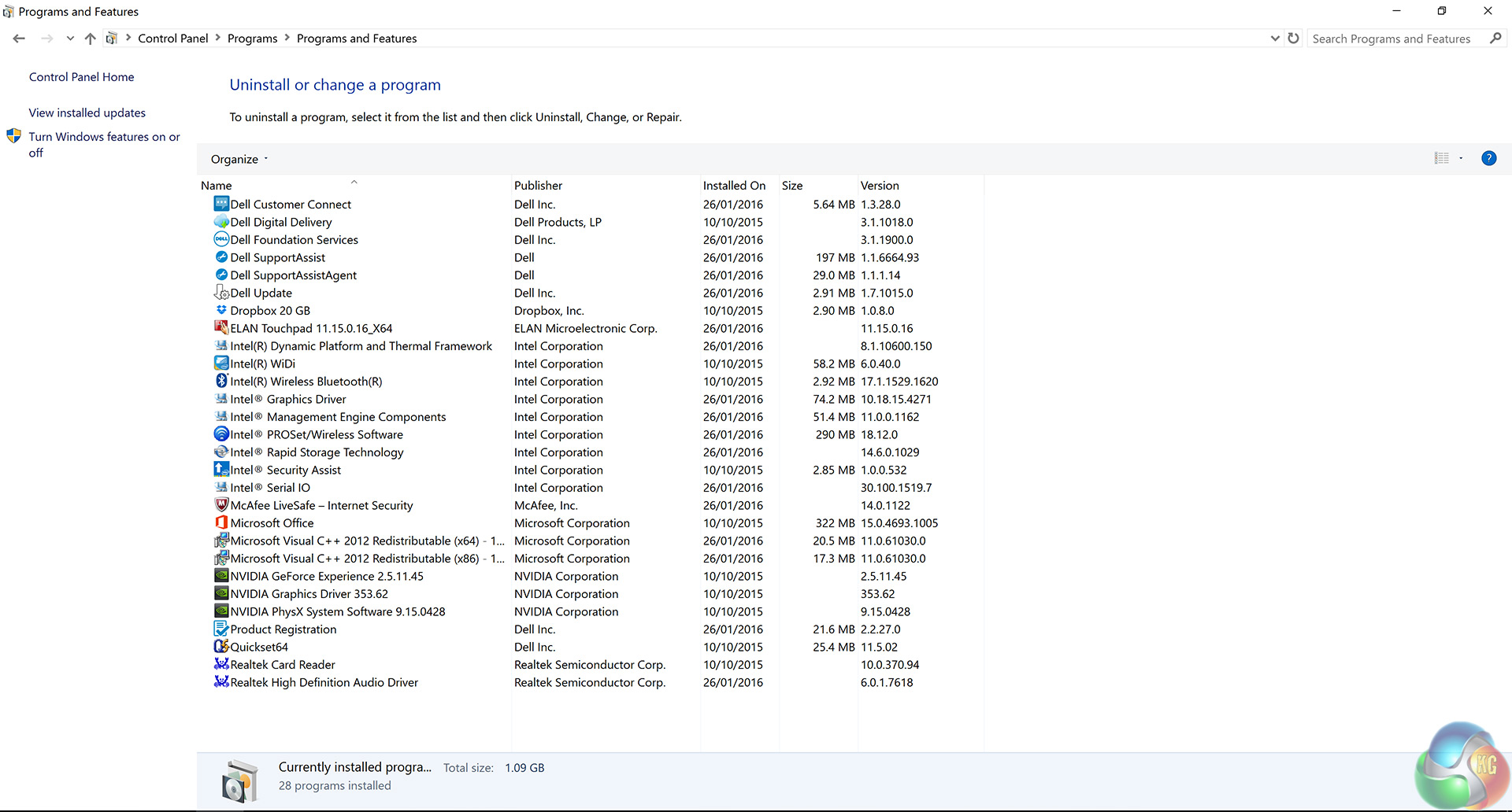 As you can see from the above screenshot, the Inspiron 15 7559 comes with little bloatware. The only exception to this would be McAfee anti-virus, which nagged me no-end – so it was uninstalled straight away.