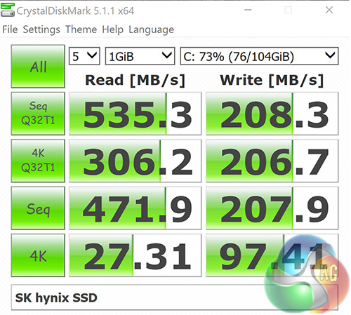 Interestingly the SK hynix 120GB M.2 SSD delivers very solid read speeds but its write speeds are lacking which is a shame. Still, booting into Windows is fast and responsive. The HDD represents fairly typical speeds for a 5400 rpm hard drive.